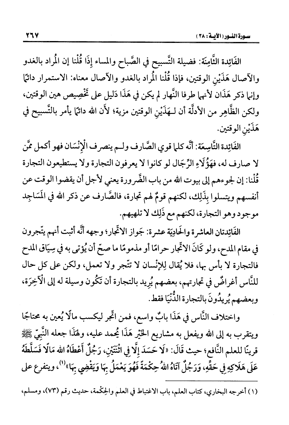 الفَائِدة التَّاسِعَة: انه كلما قوي الصَّارف ولم ينصرف الْإِنْسَان فهو أكمل ممَّن لا صارف له، فهَؤُلَاءِ الرِّجَال لو كانوا لا يعرفون التجارة ولا يستطيعون التجارة قُلْنا: إن لجوءهم إلى بيوت الله من باب الضَّرورة يعني لأجل أن يقضوا الوقت عن أنفسهم ويتسلوا بِذَلِك، لكنهم قومٌ لهم تجارة، فالصَّارف عن ذكر الله في المَسَاجِد موجود وهو التجارة، لكنهم مع ذَلِك لا تلهيهم.