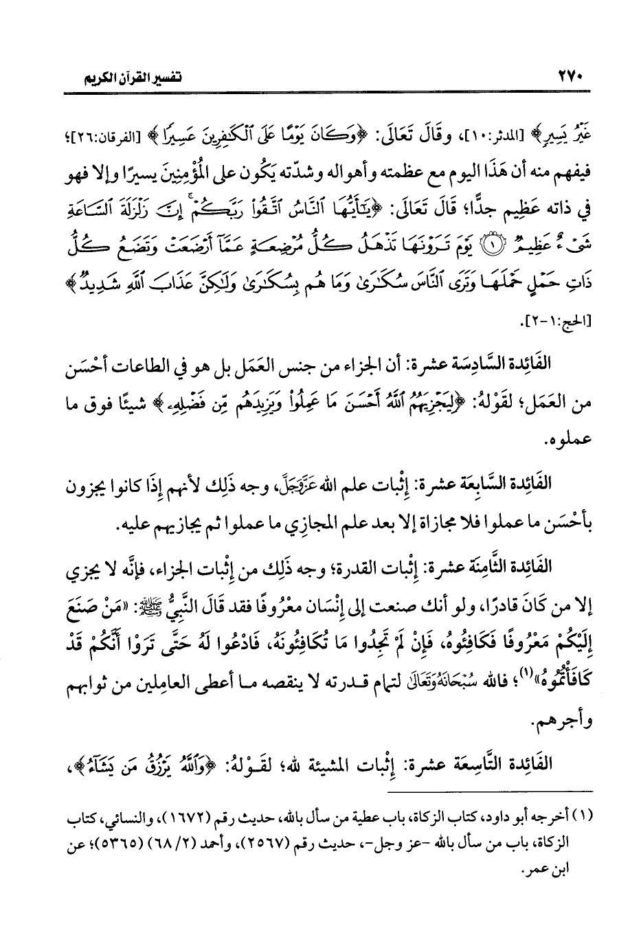 الفَائِدة الثَّامِنة عشرة: إِثْبات القدرة، وجه ذَلِك من إِثْبات الجزاء، فإنَّه لا يجزي إلَّا من كَانَ قادرًا، ولو أنك صنعت إلى إِنْسَان معْرُوفًا فقد قَالَ النَّبِيُّ - صلى الله عليه وسلم -: "مَنْ صَنَعَ إِلَيْكُمْ مَعْرُوفًا فَكَافِئُوهُ، فَإِنْ لَمْ تَجِدُوا مَا تُكَافِئُونَهُ، فَادْعُوا لَهُ حَتَّى تَرَوْا أَنَّكُمْ قَدْ كَافَأْتُمُوهُ" (٩)؛ فالله سُبْحَانَهُ وَتَعَالى لتمام قدرته لا ينقصه ما أعطى العامِلين من ثوابهم وأجرهم.
