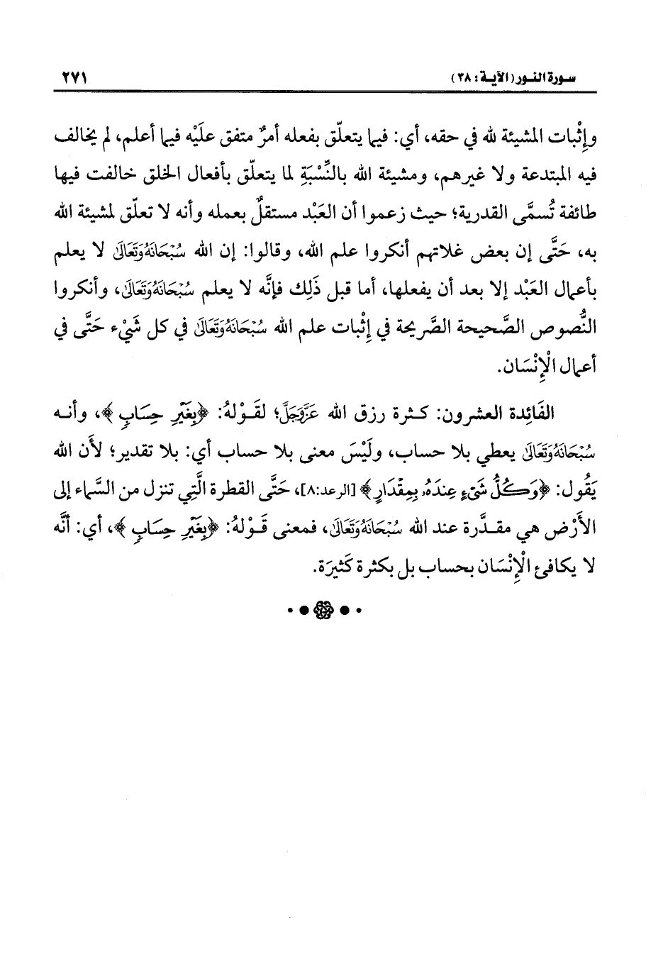 الفَائِدة العشرون: كثرة رزق الله عَزَّ وَجَلَّ؛ لقَوْله: {بِغَيْرِ حِسَابٍ}، وأنه سُبْحَانَهُ وَتَعَالَى يعطي بلا حساب، ولَيْسَ معنى بلا حساب أي: بلا تقدير؛ لأَن الله يَقُول: {وَكُلُّ شَيْءٍ عِنْدَهُ بِمِقْدَارٍ} [الرعد: ٨]، حَتَّى القطرة الَّتِي تنزل من السَّماء إلى الأَرْض هي مقدَّرة عند الله سُبْحَانَهُ وَتَعَالَى، فمعنى قَوْلهُ: {بِغَيْرِ حِسَابٍ}، أي: أنَّه لا يكافئ الْإِنْسَان بحساب بل بكثرة كَثيرَة.