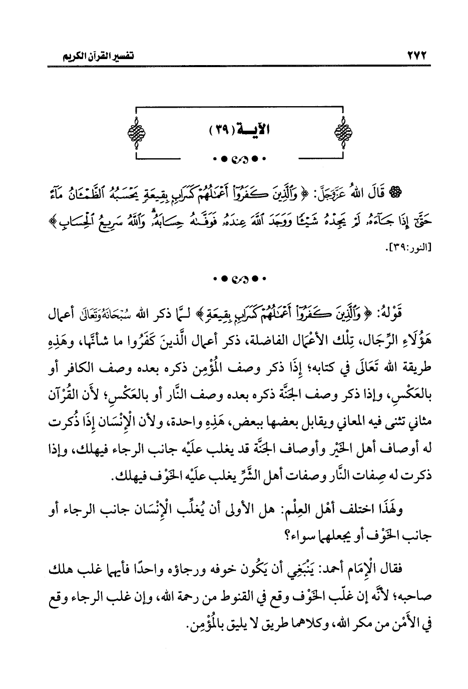 قَوْلهُ: {وَالَّذِينَ كَفَرُوا أَعْمَالُهُمْ كَسَرَابٍ بِقِيعَةٍ} لمَّا ذكر الله سُبْحَانَهُ وَتَعَالى أعمال هَؤُلَاءِ الرجَال، تِلْك الأعْمَال الفاضلة، ذكر أعمال الَّذينَ كَفَرُوا ما شأنَّها، وهَذ طريقة الله تَعَالَى في كتابه؛ إِذَا ذكر وصف المُؤْمِن ذكره بعده وصف الكافر أو بالعَكْسِ، وإذا ذكر وصف الجَنَّة ذكره بعده وصف النَّار أو بالعَكْسِ؛ لأَن القُرْآن مثاني تثنى فيه المعاني ويقابل بعضها ببعض، هَذِهِ واحدة، ولأن الْإِنْسَان إِذَا ذُكرت له أوصاف أهل الخَيْر وأوصاف الجنَّة قد يغلب علَيْه جانب الرجاء فيهلك، وإذا ذكرت له صِفات النَّار وصفات أهل الشَّرِّ يغلب علَيْه الخَوْف فيهلك.