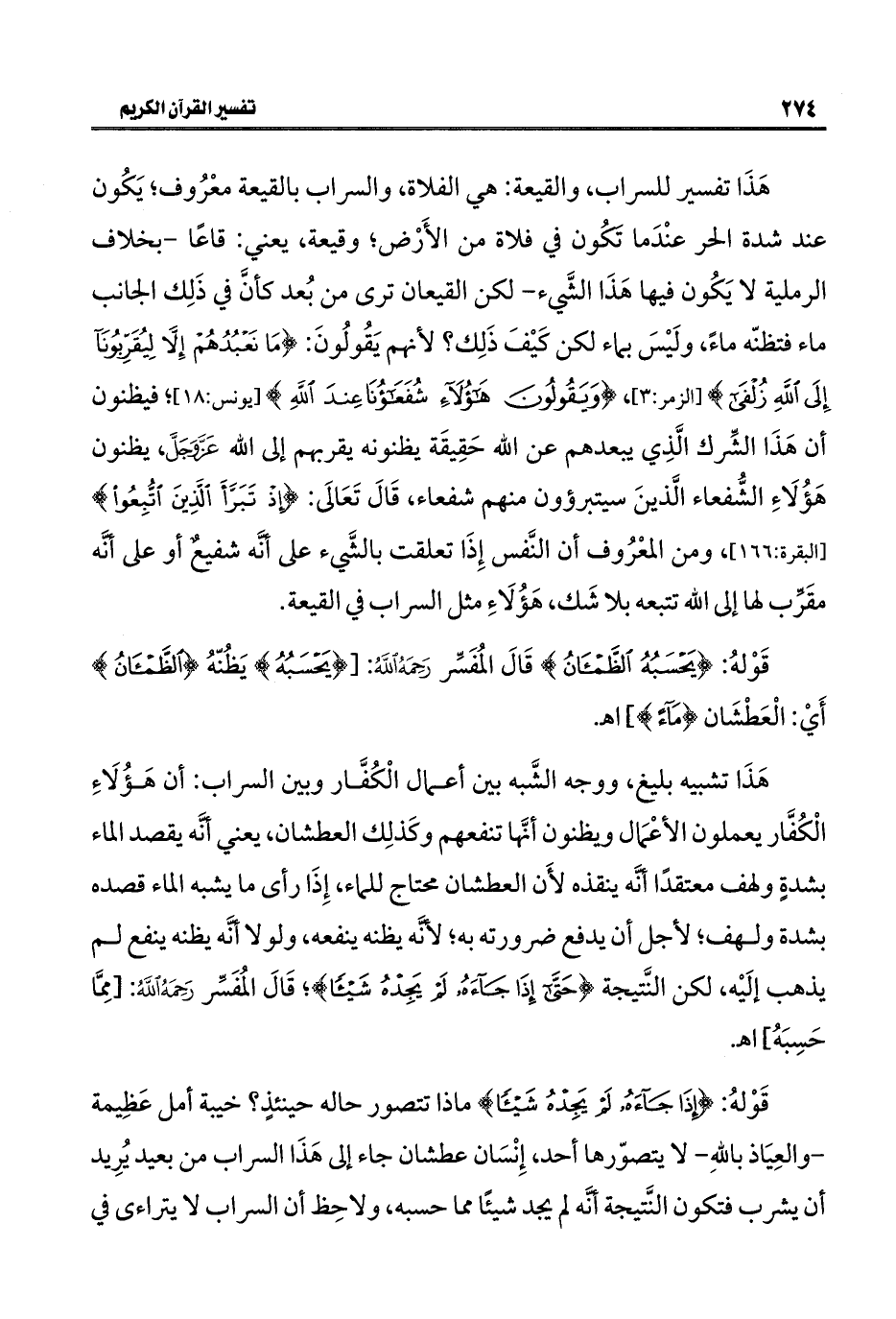 هَذَا تفسير للسراب، والقيعة: هي الفلاة، والسراب بالقيعة معْرُوف؛ يَكُون عند شدة الحر عنْدَما تَكُون في فلاة من الأَرْض، وقيعة، يعني: قاعًا -بخلاف الرملية لا يَكُون فيها هَذَا الشَّيء- لكن القيعان ترى من بُعد كأنَّ في ذَلِك الجانب ماء فتظنّه ماءً، ولَيْسَ بماء لكن كَيْفَ ذَلِك؟ لأنهم يَقُولُونَ: {مَا نَعْبُدُهُمْ إِلَّا لِيُقَرِّبُونَا إِلَى اللَّهِ زُلْفَى} [الزمر: ٣]، {وَيَقُولُونَ هَؤُلَاءِ شُفَعَاؤُنَا عِنْدَ اللَّهِ} [يونس: ١٨]؛ فيظنون أن هَذَا الشِّرك الَّذِي يبعدهم عن الله حَقِيقَة يظنونه يقربهم إلى الله عَزَّ وَجَلَّ، يظنون هَؤُلَاءِ الشُّفعاء الَّذينَ سيتبرؤون منهم شفعاء، قَالَ تَعَالَى: {إِذْ تَبَرَّأَ الَّذِينَ اتُّبِعُوا} [البقرة: ١٦٦]، ومن المعْرُوف أن النَّفس إِذَا تعلقت بالشَّيء على أنَّه شفيع أو على أنَّه مقَرِّب لها إلى الله تتبعه بلا شَك، هَؤُلَاءِ مثل السراب في القيعة.
