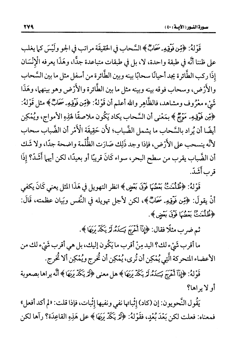 قَوْلهُ: {مِنْ فَوْقِهِ سَحَابٌ} السَّحاب في الحقيقَة مراتب في الجو ولَيْسَ كما يغلب على ظننا أنَّه في طبقة واحدة، لا، بل في طبقات متباعدة جدًّا، وهَذَا يعرفه الْإِنْسَان إِذَا ركب الطَّائرة يجد أحيانًا سحابًا بينه وبين الطَّائرة من أسفل مثل ما بين السَّحاب والأَرْض، وسحاب فوقه بينه وبينه مثل ما بين الطَّائرة والأَرْض وهو بينهما، وهَذَا شَيْء معْرُوف ومشاهد، فالظَّاهِر والله أعلم أن قَوْلهُ: {مِنْ فَوْقِهِ سَحَابٌ} مثل قَوْلهُ: {مِنْ فَوْقِهِ مَوْجٌ} بمَعْنى أن السَّحاب يكاد يَكُون ملاصقًا لهذه الأمواج، ويُمْكِن أيضا أن يُراد بالسَّحاب ما يشمل الضَّباب؛ لأَن حَقِيقَة الْأَمْر أن الضَّباب سحاب لأَنَّه ينسحب على الأَرْض، فإذا وجد ذَلِك صَارَت الظُّلْمة واضحة جدًّا، ولا شَك أن الضَّباب يقرب من سطح البحر، سواء كَانَ قريبًا أو بعيدًا، لكن أيهما أَشَدّ؟ إِذَا قرب أَشَدّ.