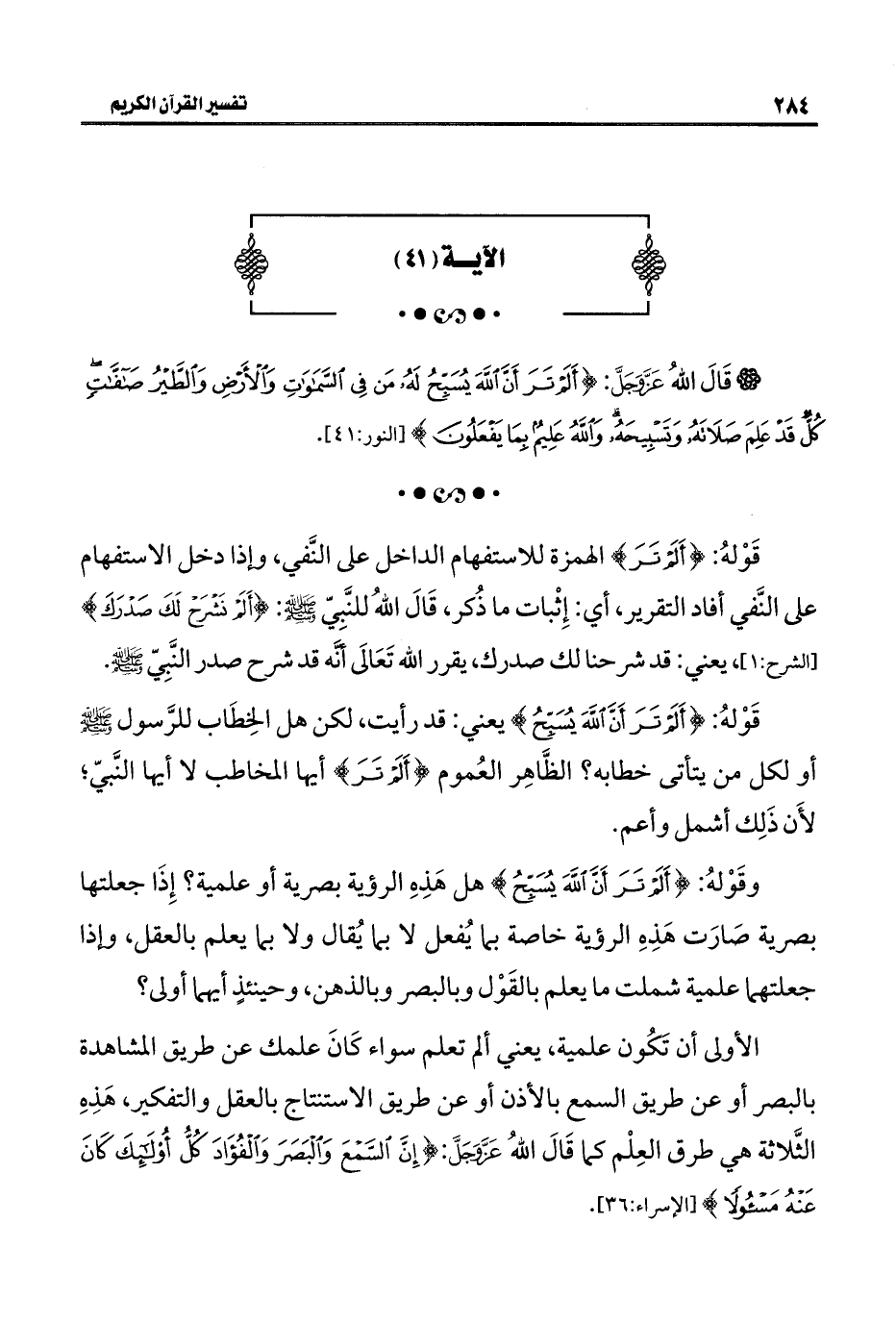 وقَوْلهُ: {أَلَمْ تَرَ أَنَّ اللَّهَ يُسَبِّحُ لَهُ} هل هَذِهِ الرؤية بصرية أو علمية؟ إِذَا جعلتها بصرية صَارَت هَذِهِ الرؤية خاصة بما يُفعل لا بما يُقال ولا بما يعلم بالعقل، وإذا جعلتهما علمية شملت ما يعلم بالقَوْل وبالبصر وبالذهن، وحينئذٍ أيهما أولى؟