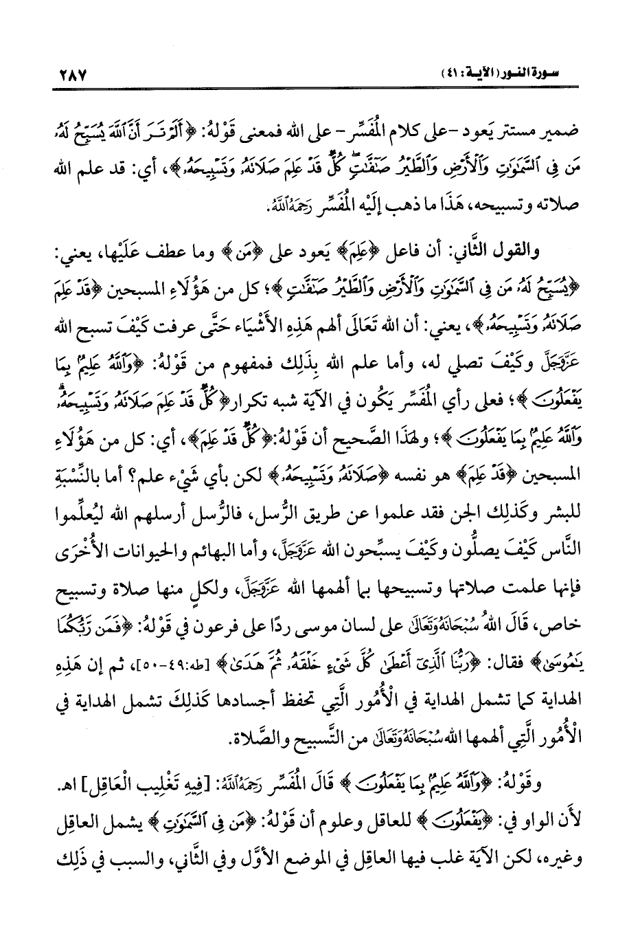 والقول الثَّاني: أن فاعل {عَلِمَ} يَعود على {مَنْ} وما عطف عَلَيْها، يعني: {يُسَبِّحُ لَهُ مَنْ فِي السَّمَاوَاتِ وَالْأَرْضِ وَالطَّيْرُ صَافَّاتٍ}؛ كل من هَؤُلَاءِ المسبحين {كُلٌّ قَدْ عَلِمَ صَلَاتَهُ وَتَسْبِيحَهُ}، يعني: أن الله تَعَالَى ألهم هَذِهِ الأَشْيَاء حَتَّى عرفت كَيْفَ تسبح الله عَزَّ وَجلَّ وكَيْفَ تصلي له، وأما علم الله بِذَلِك فمفهوم من قَوْلهُ: {وَاللَّهُ عَلِيمٌ بِمَا يَفْعَلُونَ}، فعلى رأي المُفَسِّر يَكُون في الآية شبه تكرار {كُلٌّ قَدْ عَلِمَ صَلَاتَهُ وَتَسْبِيحَهُ وَاللَّهُ عَلِيمٌ بِمَا يَفْعَلُونَ}؛ ولِهَذَا الصحيح أن قَوْلهُ: {كُلٌّ قَدْ عَلِمَ}، أي: كل من هَؤُلَاءِ المسبحين {كُلٌّ قَدْ عَلِمَ} هو نفسه {صَلَاتَهُ وَتَسْبِيحَهُ} لكن بأي شَيْء علم؛ أما بالنِّسْبَةِ للبشر وكَذلِك الجن فقد علموا عن طريق الرُّسل، فالرُّسل أرسلهم الله ليُعلِّموا النَّاس كَيْفَ يصلُّون وكَيْفَ يسبِّحون الله عَزَّ وَجَلَّ، وأما البهائم والحيوانات الأُخْرَى فإنها علمت صلاتهها وتسبيحها بما ألهمها الله عَزَّ وَجَلَّ، ولكلٍ منها صلاة وتسبيح خاص، قَالَ اللهُ سُبْحَانَهُ وَتَعَالَى على لسان موسى ردًّا على فرعون في قَوْلهُ: {فَمَنْ رَبُّكُمَا يَامُوسَى} فقال: {رَبُّنَا الَّذِي أَعْطَى كُلَّ شَيْءٍ خَلْقَهُ ثُمَّ هَدَى} [طه: ٤٩، ٥٠]، ثم إن هَذِهِ الهداية كما تشمل الهداية في الْأُمُور الَّتِي تحفظ أجسادها كَذلِكَ تشمل الهداية في الْأُمُور الَّتِي ألهمها الله سُبْحَانَهُ وَتَعَالَى من التَّسبيح والصَّلاة.