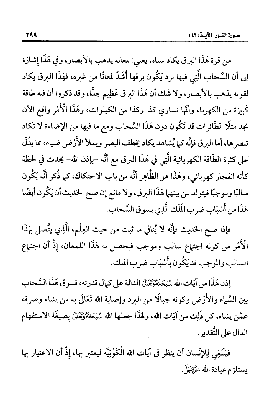 إذن هَذَا من آيات الله سُبْحَانَهُ وَتَعَالى الدالة على كمال قدرته، فسوق هَذَا السَّحاب بين السَّماء والأَرْض وكونه جبالًا من البرد وإصابة الله تَعَالَى به من يشاء وصرفه عمَّن يشاء، كل ذَلِك من آيات الله، ولِهَذَا جعلها الله سُبْحَانَهُ وَتَعَالى بِصيغَة الاستفهام الدال على التَّقدير.