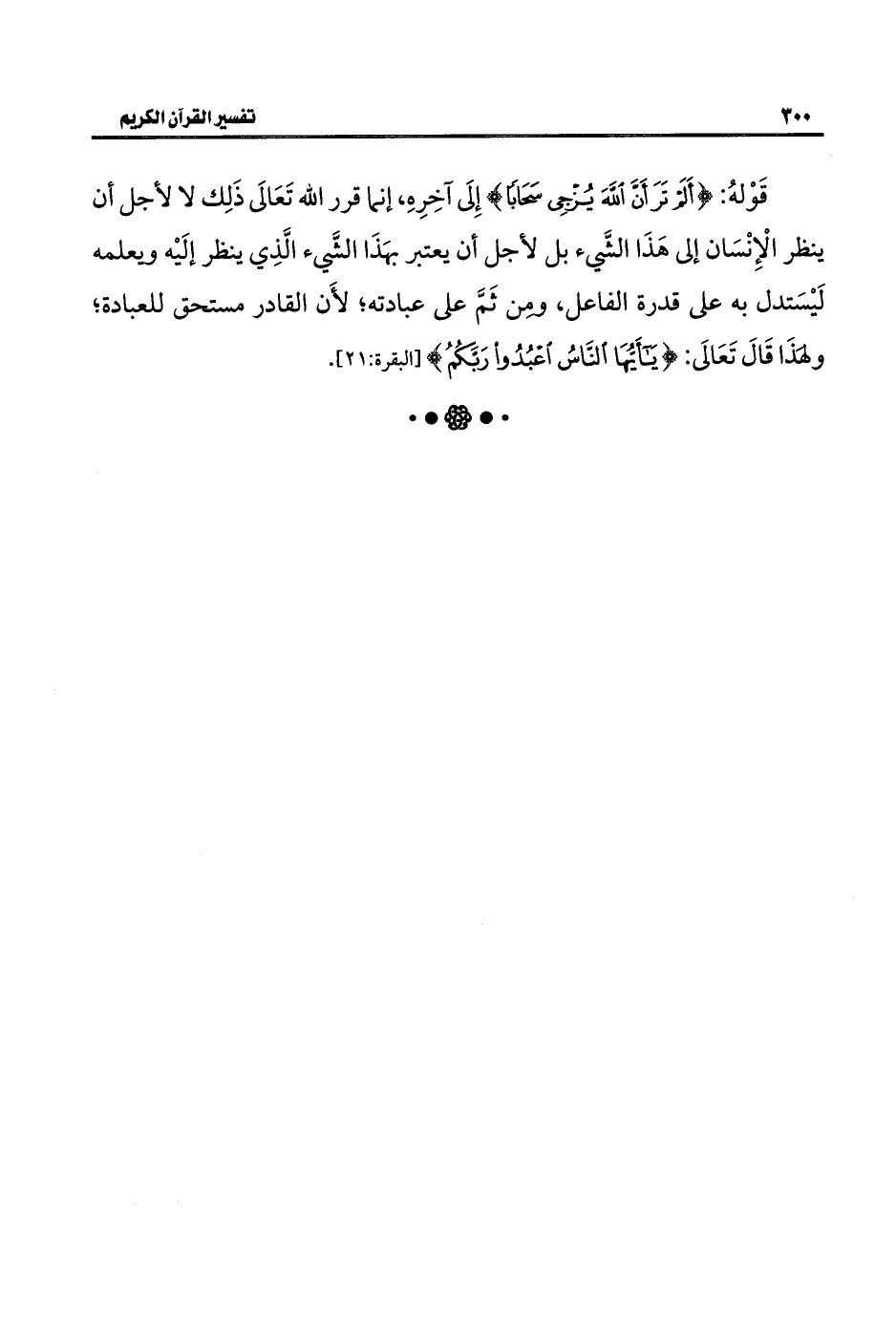 قَوْلهُ: {أَلَمْ تَرَ أَنَّ اللَّهَ يُزْجِي سَحَابًا} إِلَى آخِرِهِ، إنما قرر الله تَعَالَى ذَلِك لا لأجل أن ينظر الْإِنْسَان إلى هَذَا الشَّيء بل لأجل أن يعتبر بهَذَا الشَّيء الَّذِي ينظر إلَيْه ويعلمه لَيْسَتدل به على قدرة الفاعل، ومن ثَمَّ على عبادته، لأَن القادر مستحق للعبادة، ولِهَذَا قَالَ تَعَالَى: {يَاأَيُّهَا النَّاسُ اعْبُدُوا رَبَّكُمُ} [البقرة: ٢١].