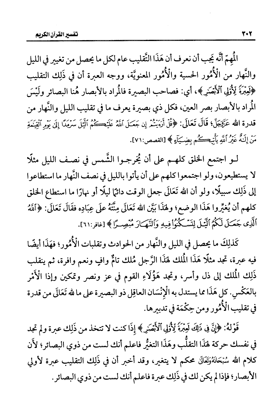 قَوْلهُ: {إِنَّ فِي ذَلِكَ لَعِبْرَةً لِأُولِي الْأَبْصَارِ} إِذَا كنت لا تتخذ من ذَلِك عبرة ولم تجد في نفسك حركة لهَذَا التقلُّب وهَذَا التغيُّر فاعلم أنك لست من ذوي البصائر؛ لأَن كلام الله سُبحَانَهُ وَتَعَالَى محكم لا يتغير، وقد أخبر أن في ذَلِك التقليب عبرة لأولي الأبصار؛ فإذا لم يكن لك في ذَلِك عبرة فاعلم أنك لست من ذوي البصائر.