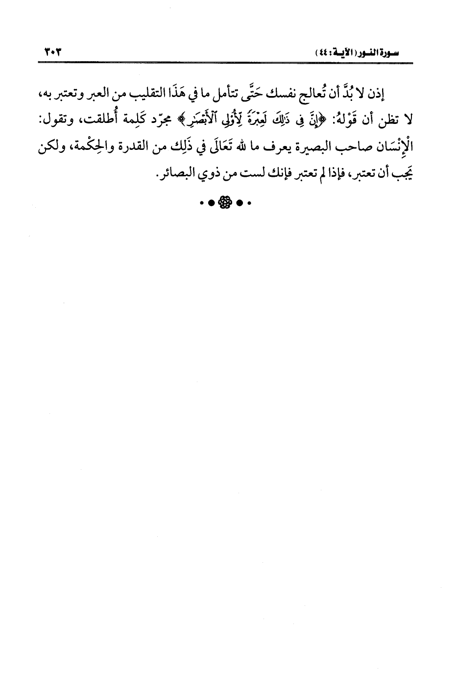 إذن لا بُدَّ أن تُعالج نفسك حَتَّى تتأمل ما في هَذَا التقليب من العبر وتعتبر به، لا تظن أن قَوْلهُ: {إِنَّ فِي ذَلِكَ لَعِبْرَةً لِأُولِي الْأَبْصَارِ} مجرّد كَلِمة أُطلقت، وتقول: الْإِنْسَان صاحب البصيرة يعرف ما لله تَعَالَى في ذَلِك من القدرة والحِكْمة، ولكن يَجب أن تعتبر، فإذا لم تعتبر فإنك لست من ذوي البصائر.