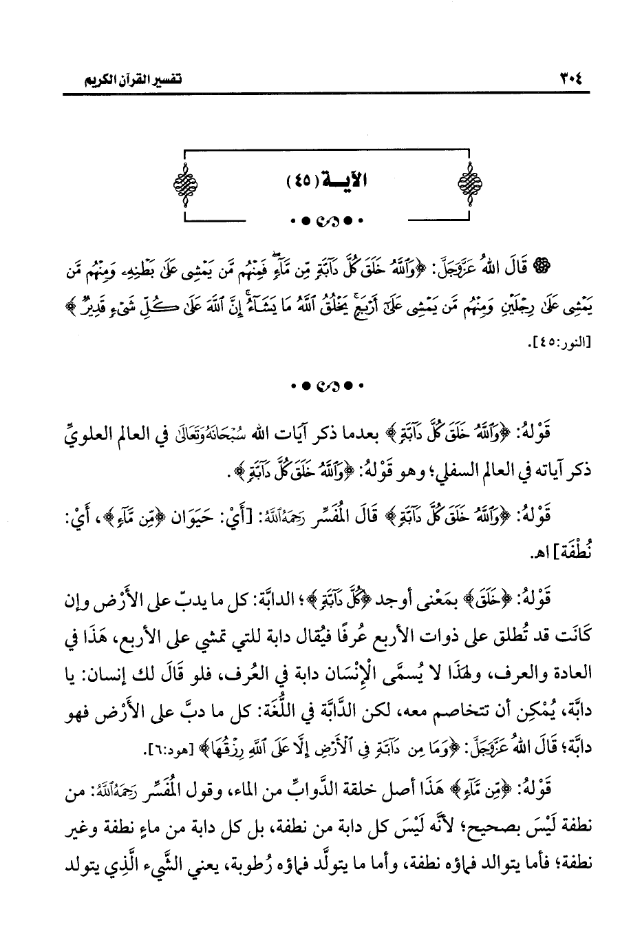 قَوْلهُ: {خَلَقَ} بمَعْنى أوجد {كُلَّ دَابَّةٍ}؛ الدابَّة: كل ما يدبّ على الأَرْض وإن كَانَت قد تُطلق على ذوات الأربع عُرفًا فيُقال دابة للتي تمشي على الأربع، هَذَا في العادة والعرف، ولهَذَا لا يُسمَّى الْإِنْسَان دابة في العُرف، فلو قَالَ لك إنسان: يا دابَّة، يُمْكِن أن تتخاصم معه، لكن الدَّابَّة في اللُّغَة: كل ما دبَّ على الأَرْض فهو دابَّة؛ قَالَ اللهُ عَزَّ وَجَلَّ: {وَمَا مِنْ دَابَّةٍ فِي الْأَرْضِ إِلَّا عَلَى اللَّهِ رِزْقُهَا} [هود: ٦].