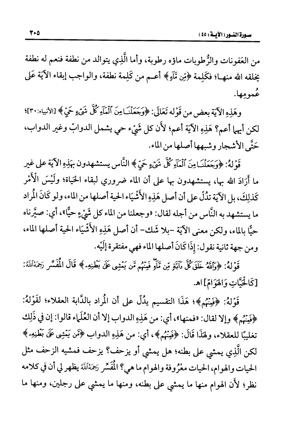 قَوْلهُ: {وَاللَّهُ خَلَقَ كُلَّ دَابَّةٍ مِنْ مَاءٍ فَمِنْهُمْ مَنْ يَمْشِي عَلَى بَطْنِهِ} قَالَ المُفَسّر رَحَمَهُ الله: [كَالحْيَّاتِ وَالهَوَامّ] اهـ.