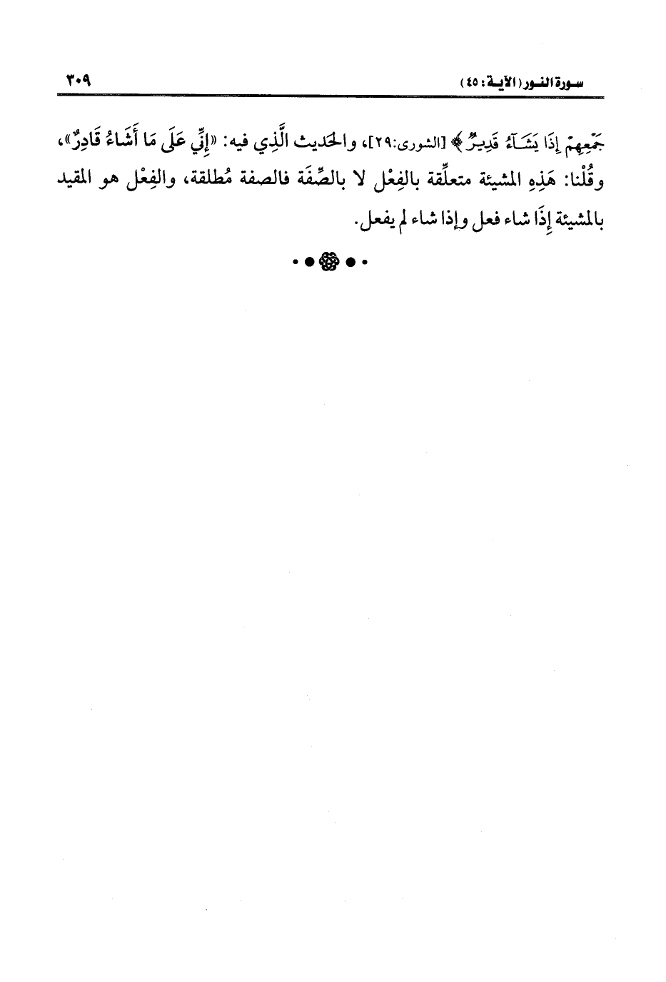 جَمْعِهِمْ إِذَا يَشَاءُ قَدِيرٌ} [الشورى: ٢٩]، والحديث الَّذِي فيه: "إِنِّي عَلَى مَا أَشَاءُ قَادِرٌ"، وقُلْنا: هَذه المشيئة متعلِّقة بالفِعْل لا بالصِّفَة فالصفة مُطلقة، والفِعْل هو المقيد بالمشيئة إِذَا شاء فعل وإذا شاء لم يفعل.