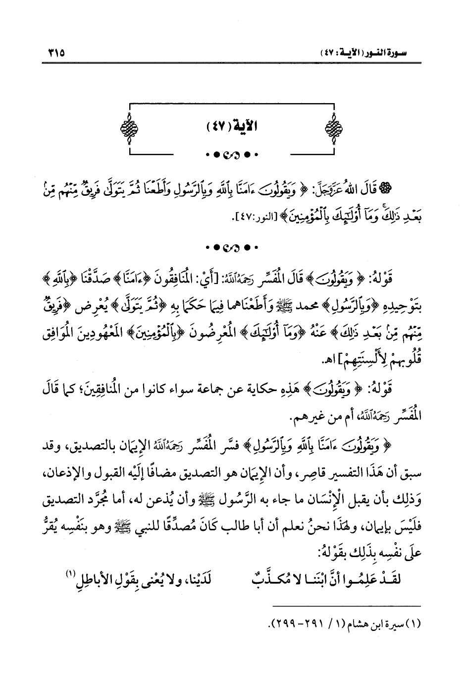 قَوْلهُ: {وَيَقُولُونَ} قَالَ المُفَسِّر رَحَمَهُ الله: [أَي: المنافِقُونَ {آمَنَّا} صَدَّقْنَا {بِاللَّهِ} بتَوْحِيدِهِ {وَبِالرَّسُولِ} محمد - صلى الله عليه وسلم - وَأَطَعْنَاهما فِيمَا حَكَمَا بِهِ {ثُمَّ يَتَوَلَّى} يُعْرِض {فَرِيقٌ مِنْهُمْ مِنْ بَعْدِ ذَلِكَ} عَنْهُ {وَمَا أُولَئِكَ} المُعْرِضُونَ {بِالْمُؤْمِنِينَ} المَعْهُودِينَ المُوَافِق قُلُوبهمْ لِأَلْسِنَتِهِمْ] اهـ.