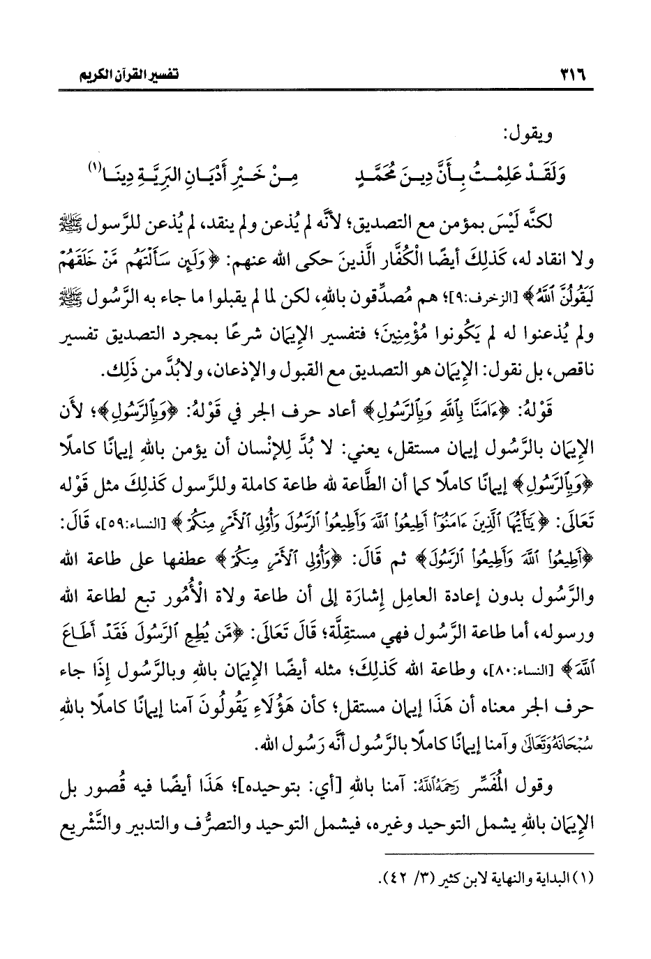 قَوْلهُ: {آمَنَّا بِاللَّهِ وَبِالرَّسُولِ} أعاد حرف الجر في قَوْلهُ: {وَبِالرَّسُولِ}؛ لأَن الإِيمَان بالرَّسُول إيمان مستقل، يعني: لا بُدَّ لِلإنْسان أن يؤمن باللهِ إيمانًا كاملًا {وَبِالرَّسُولِ} إيمانًا كاملًا كما أن الطَّاعة لله طاعة كاملة وللرَّسول كَذلِكَ مثل قَوْله تَعَالَى: {يَاأَيُّهَا الَّذِينَ آمَنُوا أَطِيعُوا اللَّهَ وَأَطِيعُوا الرَّسُولَ وَأُولِي الْأَمْرِ مِنْكُمْ} [النساء: ٥٩]، قَالَ: {أَطِيعُوا اللَّهَ وَأَطِيعُوا الرَّسُولَ} ثم قَالَ: {وَأُولِي الْأَمْرِ مِنْكُمْ} عطفها على طاعة الله والرَّسُول بدون إعادة العامِل إِشارَة إلى أن طاعة ولاة الْأُمُور تبع لطاعة الله ورسوله، أما طاعة الرَّسُول فهي مستقِلَّة؛ قَالَ تَعَالَى: {مَنْ يُطِعِ الرَّسُولَ فَقَدْ أَطَاعَ اللَّهَ} [النساء: ٨٠]، وطاعة الله كَذلِكَ؛ مثله أيضًا الإِيمَان باللهِ وبالرَّسُول إِذَا جاء حرف الجر معناه أن هَذَا إيمان مستقل؛ كأن هَؤُلَاءِ يَقُولُونَ آمنا إيمانًا كاملًا باللهِ سُبحَانَهُ وَتَعَالى وآمنا إيمانًا كاملًا بالرَّسُول أنَّه رَسُول الله.