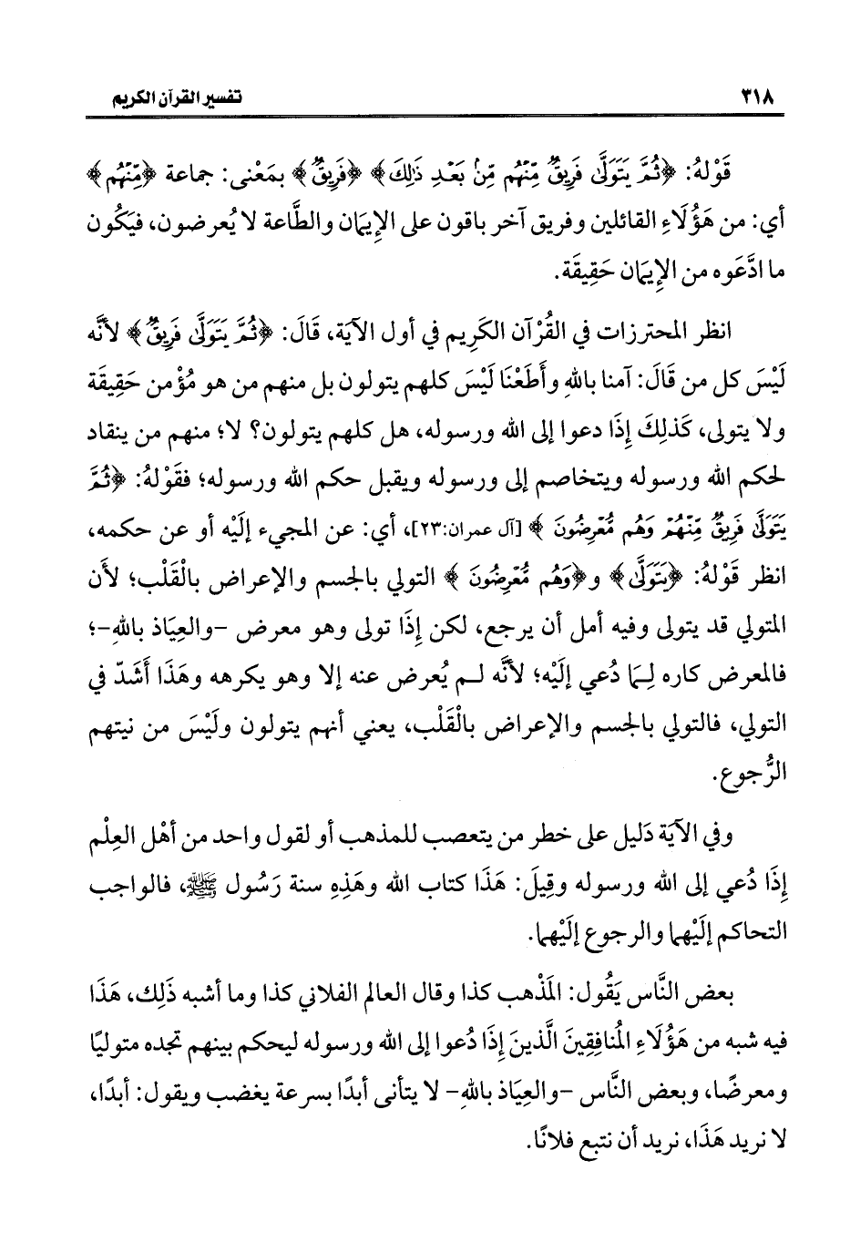 انظر المحترزات في القُرْآن الكَرِيم في أول الآيَة، قَالَ: {ثُمَّ يَتَوَلَّى فَرِيقٌ} لأنه لَيْسَ كل من قَالَ: آمنا باللهِ وأَطَعْنَا لَيْسَ كلهم يتولون بل منهم من هو مُؤْمن حَقِيقَة ولا يتولى، كَذلِكَ إِذَا دعوا إلى الله ورسوله، هل كلهم يتولون؟ لا؛ منهم من ينقاد لحكم الله ورسوله ويتخاصم إلى ورسوله ويقبل حكم الله ورسوله؟ فقَوْلهُ: {ثُمَّ يَتَوَلَّى فَرِيقٌ مِنْهُمْ وَهُمْ مُعْرِضُونَ} [آل عمران: ٢٣]، أي: عن المجيء إلَيْه أو عن حكمه، انظر قَوْلهُ: {يَتَوَلَّى} و {وَهُمْ مُعْرِضُونَ} التولي بالجسم والإعراض بالْقَلْب؛ لأَن المتولي قد يتولى وفيه أمل أن يرجع، لكن إِذَا تولى وهو معرض - والعِيَاذ باللهِ -؛ فالمعرض كاره لِمَا دُعي إلَيْه؛ لأنَّه لم يُعرض عنه إلا وهو يكرهه وهَذَا أَشَدّ في التولي، فالتولي بالجسم والإعراض بالْقَلْب، يعني أنهم يتولون ولَيْسَ من نيتهم الرُّجوع.