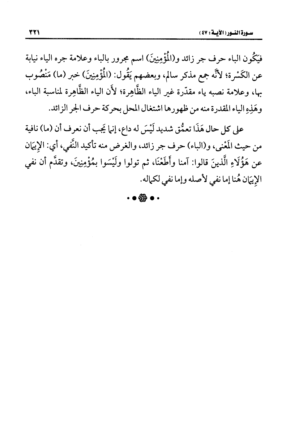على كل حال هَذَا تعمُّق شديد لَيْسَ له داع، إنما يَجب أن نعرف أن (ما) نافية من حيث المَعْنى، و (الباء) حرف جر زائد، والغرض منه تأكيد النَّفي، أي: الإِيمَان عن هَؤُلَاءِ الَّذينَ قالوا: آمنا وأَطَعْنَا، ثم تولوا ولَيْسَوا بمُؤْمِنينَ، وتقدَّم أن نفي الإِيمَان هُنا إما نفي لأصله وإما نفي لكماله.