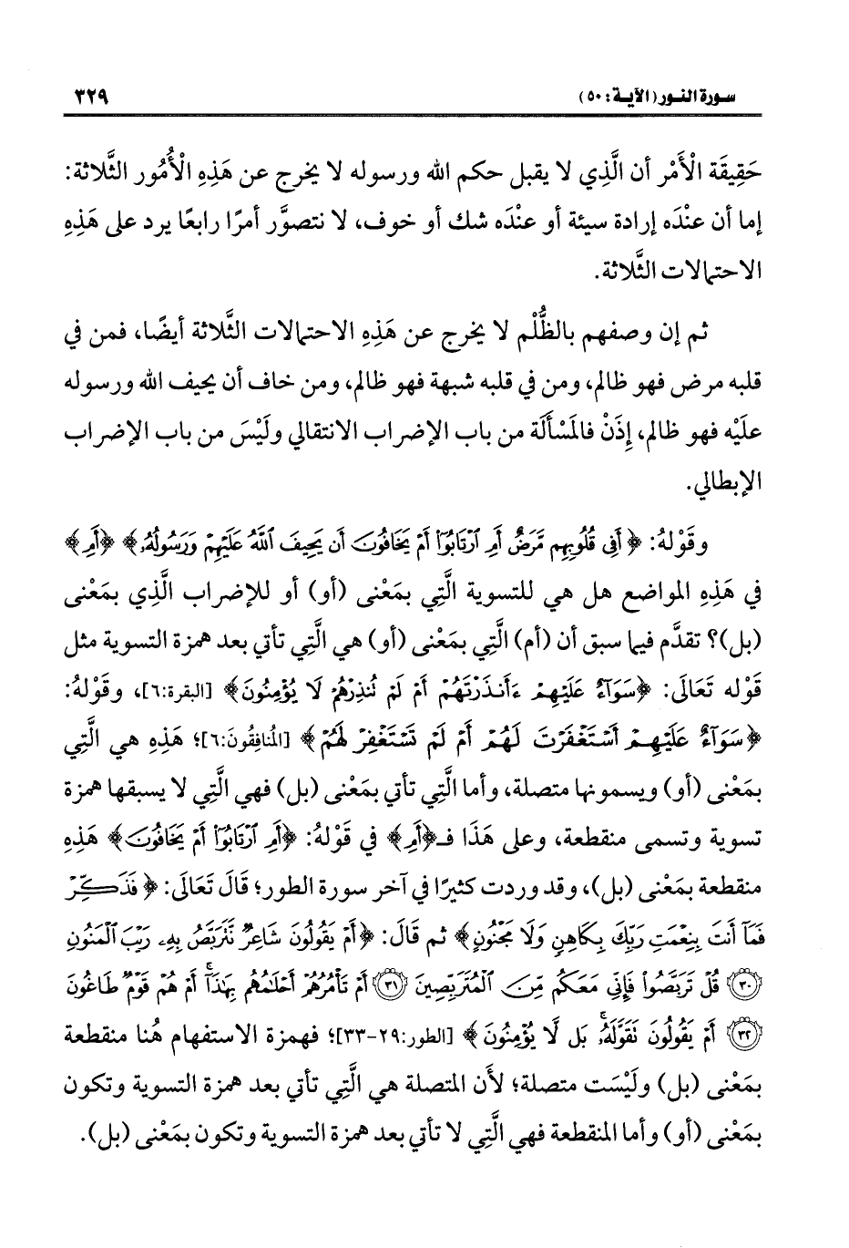 وقَوْلهُ: {أَفِي قُلُوبِهِمْ مَرَضٌ أَمِ ارْتَابُوا أَمْ يَخَافُونَ أَنْ يَحِيفَ اللَّهُ عَلَيْهِمْ وَرَسُولُهُ} {أَمِ} في هَذه المواضع هل هي للتسوية الَّتِي بمَعْنى (أو) أو للإضراب الَّذِي بمَعْنى (بل)؟ تقدَّم فيما سبق أن (أم) الَّتِي بمَعْنى (أو) هي الَّتِي تأتي بعد همزة التسوية مثل قَوْله تَعَالَى: {سَوَاءٌ عَلَيْهِمْ أَأَنْذَرْتَهُمْ أَمْ لَمْ تُنْذِرْهُمْ لَا يُؤْمِنُونَ} [البقرة: ٦]، وقَوْلهُ: {سَوَاءٌ عَلَيْهِمْ أَسْتَغْفَرْتَ لَهُمْ أَمْ لَمْ تَسْتَغْفِرْ لَهُمْ} [المُنافِقُونَ: ٦]؛ هَذه هي الَّتِي بمَعْنى (أو) ويسمونها متصلة، وأما الَّتِي تأتي بمَعْنى (بل) فهي الَّتِي لا يسبقها همزة تسوية وتسمى منقطعة، وعلى هَذَا فـ {أَمْ} في قَوْلهُ: {أَمِ ارْتَابُوا أَمْ يَخَافُونَ} هَذِهِ منقطعة بمَعْنى (بل)، وقد وردت كثيرًا في آخر سورة الطور؛ قَالَ تَعَالَى: {فَذَكِّرْ فَمَا أَنْتَ بِنِعْمَتِ رَبِّكَ بِكَاهِنٍ وَلَا مَجْنُونٍ} ثم قَالَ: {أَمْ يَقُولُونَ شَاعِرٌ نَتَرَبَّصُ بِهِ رَيْبَ الْمَنُونِ (٣٠) قُلْ تَرَبَّصُوا فَإِنِّي مَعَكُمْ مِنَ الْمُتَرَبِّصِينَ (٣١) أَمْ تَأْمُرُهُمْ أَحْلَامُهُمْ بِهَذَا أَمْ هُمْ قَوْمٌ طَاغُونَ (٣٢) أَمْ يَقُولُونَ تَقَوَّلَهُ بَلْ لَا يُؤْمِنُونَ} [الطور: ٢٩ - ٣٣]؛ فهمزة الاستفهام هُنا منقطعة بمَعْنى (بل) ولَيْسَت متصلة؛ لأَن المتصلة هي الَّتِي تأتي بعد همزة التسوية وتكون بمَعْنى (أو) وأما المنقطعة فهي الَّتِي لا تأتي بعد همزة التسوية وتكون بمَعْنى (بل).