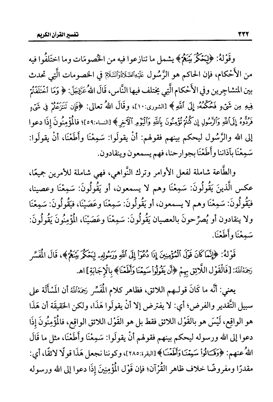 قَوْلهُ: {إِنَّمَا كَانَ قَوْلَ الْمُؤْمِنِينَ إِذَا دُعُوا إِلَى اللَّهِ وَرَسُولِهِ لِيَحْكُمَ بَيْنَهُمْ}، قَالَ المُفَسِّر رَحَمَهُ اللهُ: [فَالْقَوْل اللَّائِق بِهِمْ {أَنْ يَقُولُوا سَمِعْنَا وَأَطَعْنَا} بِالْإِجَابَةِ] اهـ.
