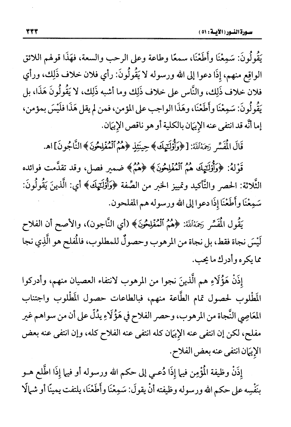 قَوْلهُ: {وَأُولَئِكَ هُمُ الْمُفْلِحُونَ} {هُمُ} ضمير فصل، وقد تقدَّمت فوائده الثَّلاثة: الحصر والتَّأكيد وتمييز الخبر من الصِّفة {وَأُولَئِكَ} أي: الَّذينَ يَقُولُونَ: سَمِعْنَا وأَطَعْنَا إِذَا دعوا إلى الله ورسوله هم المفلحون.