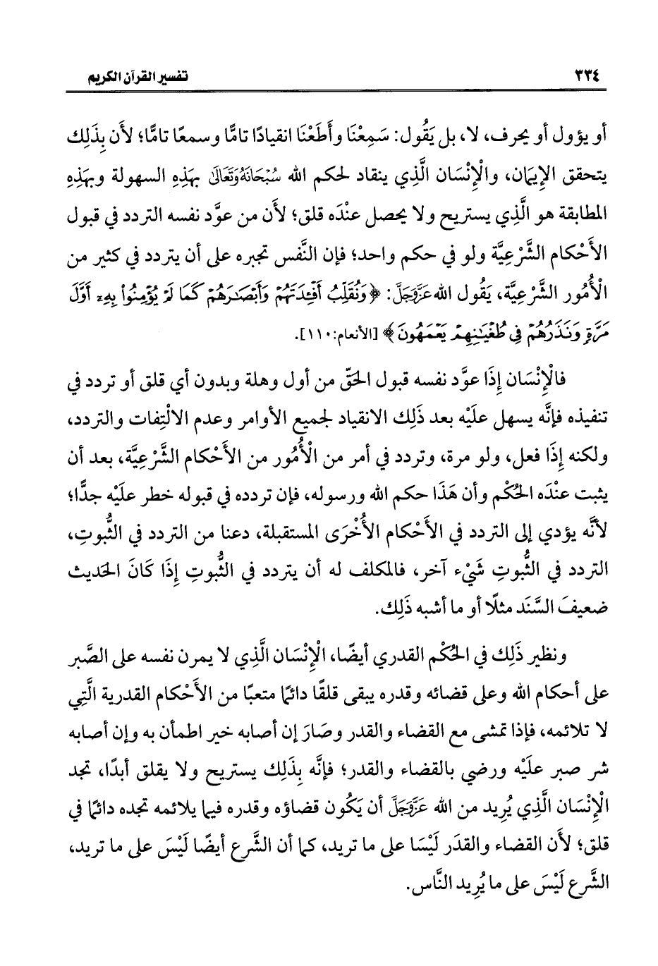 أو يؤول أو يحرف، لا، بل يَقُول: سَمِعْنَا وأَطَعْنَا انقيادًا تامًّا وسمعًا تامًّا؛ لأَن بِذَلِك يتحقق الإِيمَان، والْإِنْسَان الَّذِي ينقاد لحكم الله سُبحَانَهُ وَتَعَالَى بهَذه السهولة وبهَذه المطابقة هو الَّذِي يستريح ولا يحصل عنْدَه قلق؛ لأَن من عوَّد نفسه التردد في قبول الأَحْكام الشَّرْعِيَّة ولو في حكم واحد؛ فإن النَّفس تجبره على أن يتردد في كثير من الْأُمُور الشَّرْعِيَّة، يَقُول الله عَزَّ وَجَلَّ: {وَنُقَلِّبُ أَفْئِدَتَهُمْ وَأَبْصَارَهُمْ كَمَا لَمْ يُؤْمِنُوا بِهِ أَوَّلَ مَرَّةٍ وَنَذَرُهُمْ فِي طُغْيَانِهِمْ يَعْمَهُونَ} [الأنعام: ١١٠].