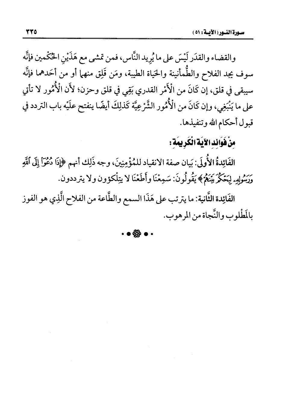 الفَائِدةُ الأُولَى: بَيان صفة الانقياد للمُؤْمِنِينَ، وجه ذَلِك أنهم {إِذَا دُعُوا إِلَى اللَّهِ وَرَسُولِهِ لِيَحْكُمَ بَيْنَهُمْ} يَقُولُونَ: سَمِعْنَا وأَطَعْنَا لا يتِلْكؤون ولا يترددون.