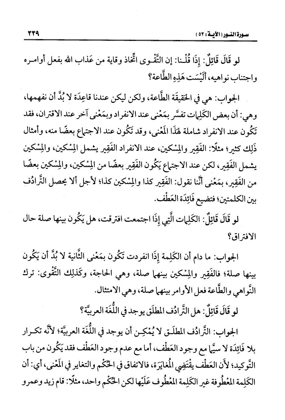 الجواب: ما دام أن الكَلِمة إِذَا انفردت تكُون بمَعْنى الثَّانية لا بُدَّ أن يَكُون بينها صلة؛ فالفَقِير والمِسْكين بينهما صلة، وهي الحاجة، وكَذلِك التَّقْوى: ترك النَّواهي والطَّاعة فعل الأوامر بينهما صلة، وهي الامتثال.