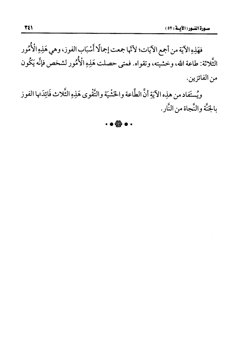 فهَذه الآيَة من أجمع الآيَات، لأنَّها جمعت إجمالًا أَسْبَاب الفوز، وهي هَذِهِ الْأُمُور الثَّلاثة: طاعة الله، وخشيته، وتقواه. فمتى حصلت هَذه الْأُمُور لشخص فإنَّه يَكُون من الفائزين.