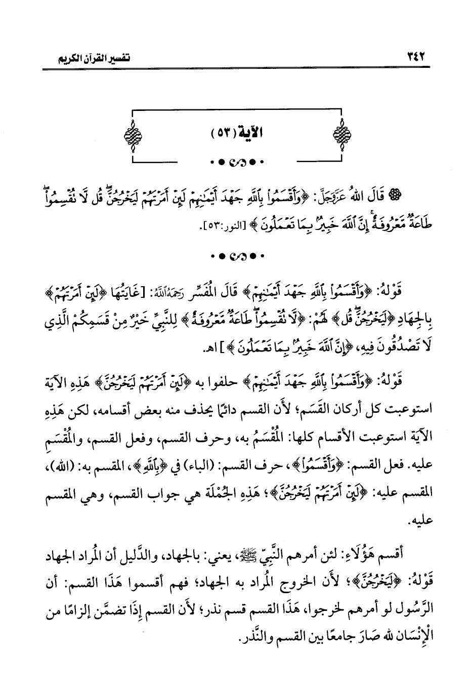 قَوْلهُ: {وَأَقْسَمُوا بِاللَّهِ جَهْدَ أَيْمَانِهِمْ} قَالَ المُفَسِّر رَحَمَهُ اللهُ: [غَايَتُهَا {لَئِنْ أَمَرْتَهُمْ} بِالجِهَادِ {لَيَخْرُجُنَّ قُلْ} لَهُمْ: {لَا تُقْسِمُوا طَاعَةٌ مَعْرُوفَةٌ} لِلنَّبِيِّ خَيْرٌ مِنْ قَسَمِكُمْ الَّذِي لَا تَصْدُقُونَ فِيهِ، {إِنَّ اللَّهَ خَبِيرٌ بِمَا تَعْمَلُونَ}] اهـ.
