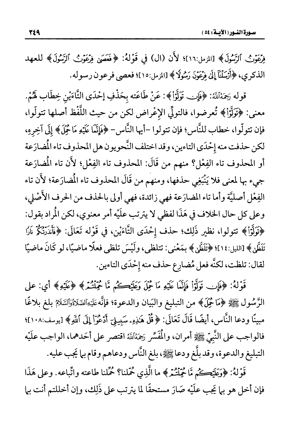 معنى: {تَوَلَّوْا} تُعرضوا، فالتولِّي الإِعْراض لكن من حيث اللَّفْظ أصلها تتولّوا، فإن تتولّوا، خطاب للنَّاس، فإن تتولوا - أيها النَّاس - {فَإِنَّمَا عَلَيْهِ مَا حُمِّلَ} إِلَى آخِرِهِ، لكن حذفت منه إِحْدَى التاءين، وقد اختلف النَّحويون هل المحذوف تاء المُضارَعة أو المحذوف تاء الفِعْل؟ منهم من قَالَ: المحذوف تاء الفِعْل، لأَن تاء المُضارَعة جيء بها لمعنى فلا يَنْبَغِي حذفها، ومنهم من قَالَ المحذوف تاء المُضارَعة؛ لأَن تاء الفِعْل أصليَّة وأما تاء المضارَعة فهي زائدة، فهي أولى بالحذف من الحرف الأَصْلي، وعلى كل حال الخلاف في هَذَا لفظي لا يترتب علَيْه أمر معنوي، لكن المُراد بقول: {تَوَلَّوْا} تتولوا، نظير ذَلِك، حذف إِحْدَى التَّاءَيْن، في قَوْله تَعَالَى: {فَأَنْذَرْتُكُمْ نَارًا تَلَظَّى} [الليل: ١٤]، {تَلَظَّى} بمَعْنى: تتلظى، ولَيْسَ تلظى فعلًا ماضيًا، لو كَانَ ماضيًا لقال: تلظت، لكنَّه فعل مُضارِع حذف منه إِحْدَى التاءين.