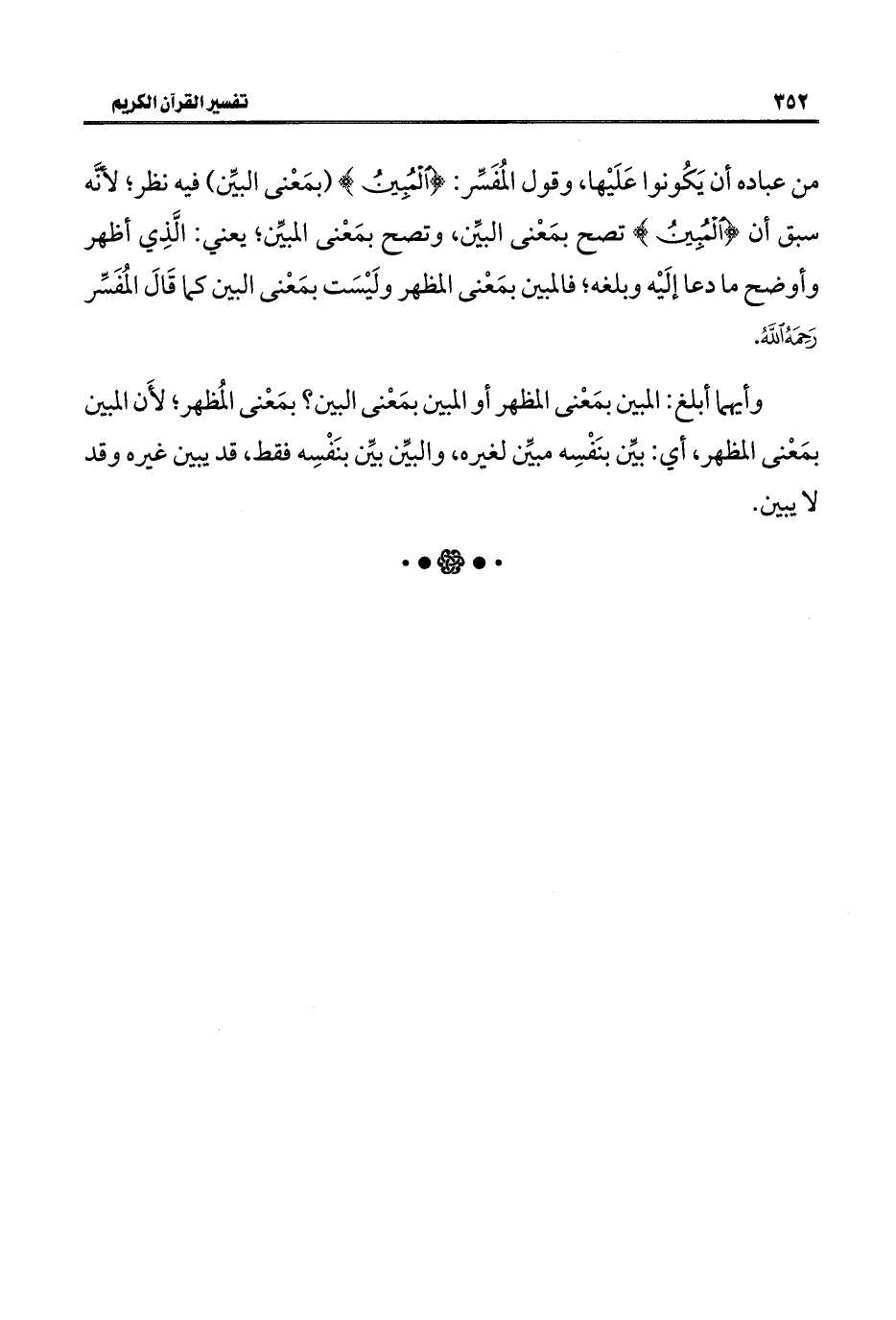 وأيهما أبلغ: المبين بمَعْنى المظهر أو المبين بمَعْنى البين؟ بمَعْنى المُظهر؛ لأَن المبين بمَعْنى المظهر، أي: بيِّن بنَفْسِه مبيِّن لغيره، والبيِّن بيِّن بنَفْسِه فقط، قد يبين غيره وقد لا يبين.