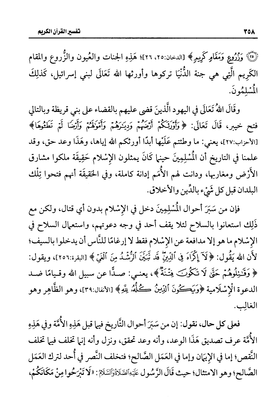 وقَالَ اللهُ تَعَالَى في اليهود الَّذينَ قضى عليهم بالقضاء على بني قريظة وبالتالي فتح خيبر، قَالَ تَعَالَى: {وَأَوْرَثَكُمْ أَرْضَهُمْ وَدِيَارَهُمْ وَأَمْوَالَهُمْ وَأَرْضًا لَمْ تَطَئُوهَا} [الأحزاب: ٢٧] يعني: ما وطئتم عَلَيْها أبدًا أورثكم الله إياها، وهَذَا وعد حق، وقد علمنا في التاريخ أن المُسْلِمِينَ حينما كَانَ يمثلون الإِسْلام حَقِيقَة ملكوا مشارق الأَرْض ومغاربها، ودانت لهم الأُمَم إدانة كاملة، وفي الحَقيقَة أنهم فتحوا تِلْك البلدان قبل كل شَيْء بالدِّين والأخلاق.
