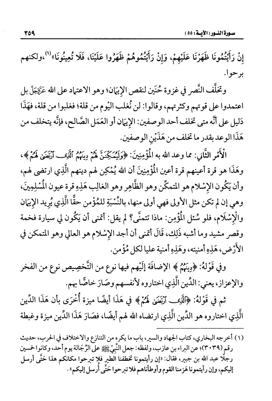 وتخلَّف النَّصر في غزوة حُنَين لنقص الإِيمَان، وهو الاعتماد على الله عَزَّ وَجلَّ بل اعتمدوا على قوتهم وكثرتهم، وقالوا: لن نُغلب اليْوم من قلة، فغلبوا من قلة، فهَذَا دَليل على أنَّه متى تخلف أحد الوصفين: الإِيمَان أو العَمَل الصَّالح، فإنَّه يتخلف من هَذَا الوعد بقدر ما تخلف من هَذَيْنِ الوصفين.