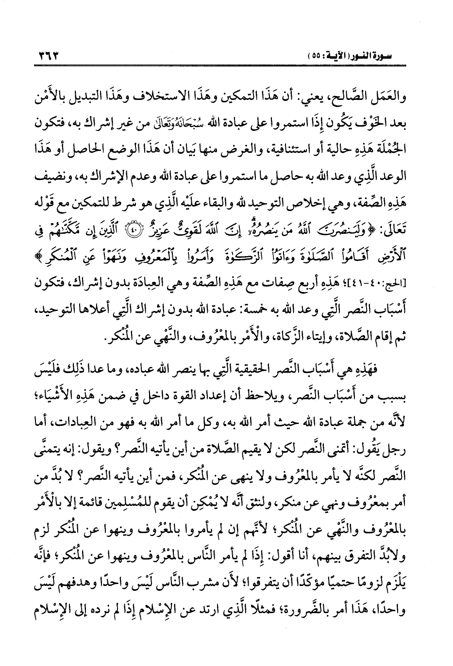 والعَمَل الصَّالح، يعني: أن هَذَا التمكين وهَذَا الاستخلاف وهَذَا التبديل بالأَمْن بعد الخَوْف يَكُون إِذَا استمروا على عبادة الله سُبْحَانَهُ وَتَعَالَى من غير إشراك به، فتكون الجُمْلَة هَذِهِ حالية أو استئنافية، والغرض منها بَيان أن هَذَا الوضع الحاصل أو هَذَا الوعد الَّذِي وعد الله به حاصل ما استمروا على عبادة الله وعدم الإشراك به، ونضيف هَذِهِ الصِّفة، وهي إخلاص التوحيد لله والبقاء علَيْه الَّذِي هو شرط للتمكين مع قَوْله تَعَالَى: {وَلَيَنْصُرَنَّ اللَّهُ مَنْ يَنْصُرُهُ إِنَّ اللَّهَ لَقَوِيٌّ عَزِيزٌ (٤٠) الَّذِينَ إِنْ مَكَّنَّاهُمْ فِي الْأَرْضِ أَقَامُوا الصَّلَاةَ وَآتَوُا الزَّكَاةَ وَأَمَرُوا بِالْمَعْرُوفِ وَنَهَوْا عَنِ الْمُنْكَرِ} [الحج: ٤٠، ٤١]؛ هَذِهِ أربع صِفات مع هَذِهِ الصِّفة وهي العِبادَة بدون إشراك، فتكون أَسْبَاب النَّصر الَّتِي وعد الله به خمسة: عبادة الله بدون إشراك الَّتِي أعلاها التوحيد، ثم إقام الصَّلاة، وإيتاء الزَّكاة، والْأَمْر بالمعْرُوف، والنَّهْي عن المُنْكر.