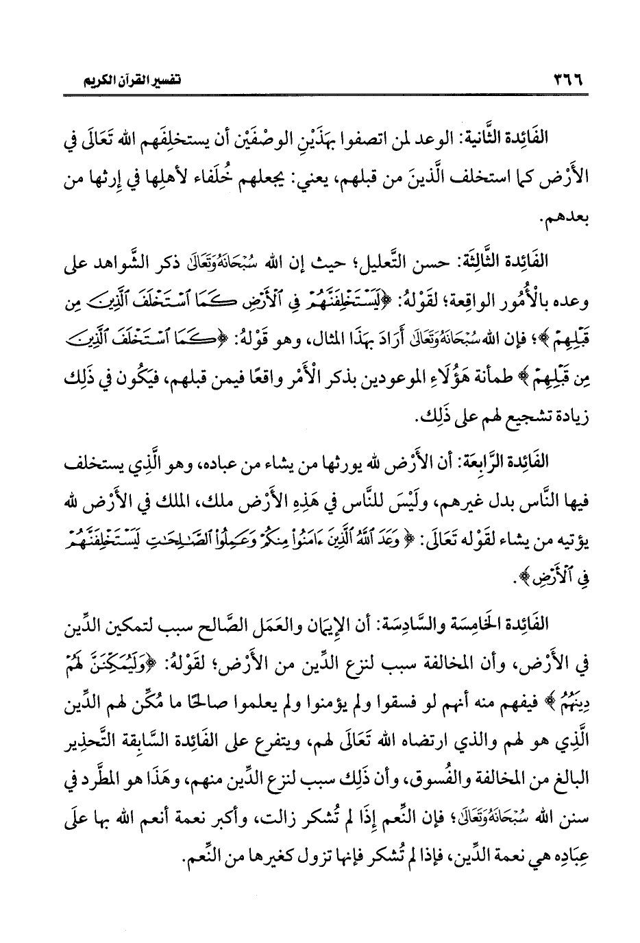 الفَائِدة الخَامِسَة والسَّادِسَة: أن الإِيمَان والعَمَل الصَّالح سبب لتمكين الدِّين في الأَرْض، وأن المخالفة سبب لنزع الدِّين من الأَرْض؛ لقَوْله: {وَلَيُمَكِّنَنَّ لَهُمْ دِينَهُمُ} فيفهم منه أنهم لو فسقوا ولم يؤمنوا ولم يعلموا صالحا ما مُكِّن لهم الدِّين الَّذِي هو لهم والذي ارتضاه الله تَعَالَى لهم، ويتفرع على الفَائِدة السَّابِقة التَّحذِير البالغ من المخالفة والفُسوق، وأن ذَلِك سبب لنزع الدِّين منهم، وهَذَا هو المطَّرد في سنن الله سُبْحَانَهُ وَتَعَالَى؛ فإن النِّعم إِذَا لم تُشكر زالت، وأكبر نعمة أنعم الله بها علَى عِبَادِه هي نعمة الدِّين، فإذا لم تُشكر فإنها تزول كغيرها من النِّعم.