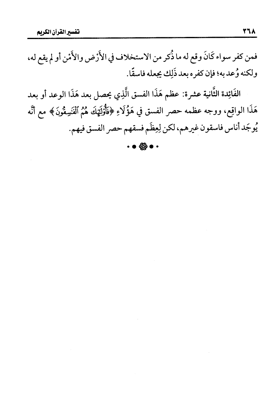 الفَائِدة الثَّانية عشرة: عظم هَذَا الفسق الَّذِي يحصل بعد هَذَا الوعد أو بعد هَذَا الواقِع، ووجه عظمه حصر الفسق في هَؤُلَاءِ {فَأُولَئِكَ هُمُ الْفَاسِقُونَ} هو مع أَنَّه يُوجَد أناس فاسقون غيرهم، لكن لِعِظَم فسقهم حصر الفسق فيهم.