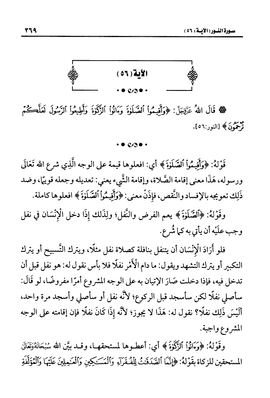 وقَوْلهُ: {الصَّلَاةَ} يعم الفرض والنَّفل؛ ولِذَلك إِذَا دخل الْإِنْسَان في نفل وجب علَيْه أن يأتي به كما شُرع.
