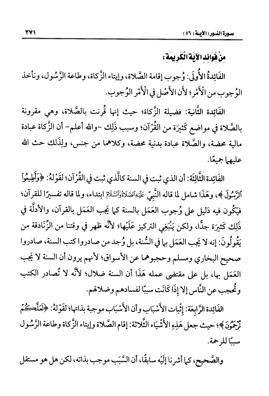 الفَائِدة الرَّابِعَة: إِثْبات الأَسْبَاب وأن الأَسْبَاب موجبة بذاتها، لقَوْله: {لَعَلَّكُمْ تُرْحَمُونَ}؛ حيث جعل هَذِهِ الأَشْيَاء الثَّلاثة: إقام الصَّلاة وإيتاء الزَّكاة وطاعة الرَّسُول سببًا للرحمة.