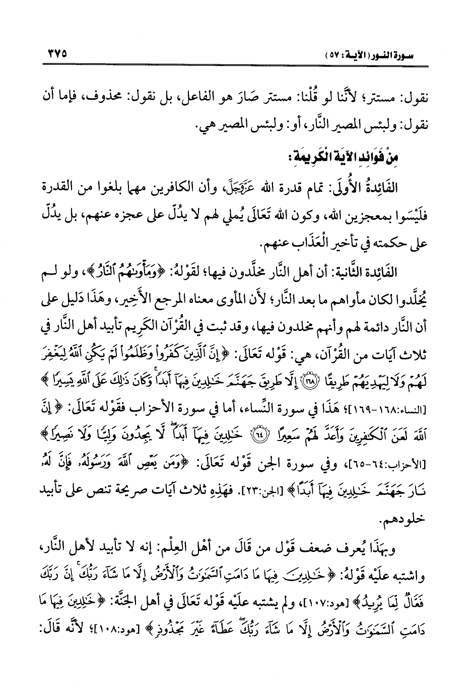 الفَائِدة الثَّانية: أن أهل النَّار مُخَلَّدون فيها؛ لقَوْله: {وَمَأْوَاهُمُ النَّارُ}، ولو لم يُخلَّدوا لكان مأواهم ما بعد النَّار، لأَن المأوى معناه المرجع الأَخِير، وهَذَا دَليل على أن النَّار دائمة لهم وأنهم مخلدون فيها، وقد ثبت في القُرْآن الكَرِيم تأبيد أهل النَّار في ثلاث آيات من القُرْآن، هي: قَوْله تَعَالَى: {إِنَّ الَّذِينَ كَفَرُوا وَظَلَمُوا لَمْ يَكُنِ اللَّهُ لِيَغْفِرَ لَهُمْ وَلَا لِيَهْدِيَهُمْ طَرِيقًا (١٦٨) إِلَّا طَرِيقَ جَهَنَّمَ خَالِدِينَ فِيهَا أَبَدًا وَكَانَ ذَلِكَ عَلَى اللَّهِ يَسِيرًا} [النساء: ١٦٨، ١٦٩]؛ هَذَا في سورة النِّساء، أما في سورة الأحزاب فقَوْله تَعَالَى: {إِنَّ اللَّهَ لَعَنَ الْكَافِرِينَ وَأَعَدَّ لَهُمْ سَعِيرًا (٦٤) خَالِدِينَ فِيهَا أَبَدًا لَا يَجِدُونَ وَلِيًّا وَلَا نَصِيرًا} [الأحزاب: ٦٤، ٦٥]، وفي سورة الجن قَوْله تَعَالَى: {وَمَنْ يَعْصِ اللَّهَ وَرَسُولَهُ فَإِنَّ لَهُ نَارَ جَهَنَّمَ خَالِدِينَ فِيهَا أَبَدًا} [الجن: ٢٣]. فهَذه ثلاث آيات صريحة تنص على تأبيد خلودهم.