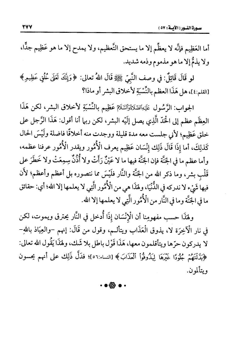 الجواب: الرَّسُول عَلَيهِ الصَّلَاةُ وَالسَّلَامُ عَظِيم بالنِّسْبَةِ لأخلاق البشر، لكن هَذَا العِظَم عظم إلى الحَدّ الَّذِي يصل إلَيْه البشر، لكن ربما أنا أقول: هَذَا الرَّجل على خلق عَظِيم، لأني جلست معه مدة قليلة ووجدت منه أخلاقًا فاضلة ولَيْسَ الحال كَذلِكَ، أما إِذَا قَالَ ذَلِك إِنْسَان عَظِيم يعرف الْأُمُور ويقدر الْأُمُور عرفنا عظمه، وأما عظم ما في الجنَّة فإن الجنَّة فيها ما لا عَيْنٌ رَأَتْ ولا أُذُنٌ سِمِعَتْ ولا خَطَرَ على قَلْبِ بشر، وما ذكر الله من الجنَّة والنَّار فلَيْسَ مما نتصوره بل أعظم وأعظم، لأَن فيها شَيْء لا ندركه في الدُّنْيَا، ولِهَذَا هي من الْأُمُور الَّتِي لا يعلمها إلَّا الله، أي: حقائق ما في الجنَّة وما في النَّار من الْأُمُور الَّتِي لا يعلمها إلَّا الله.