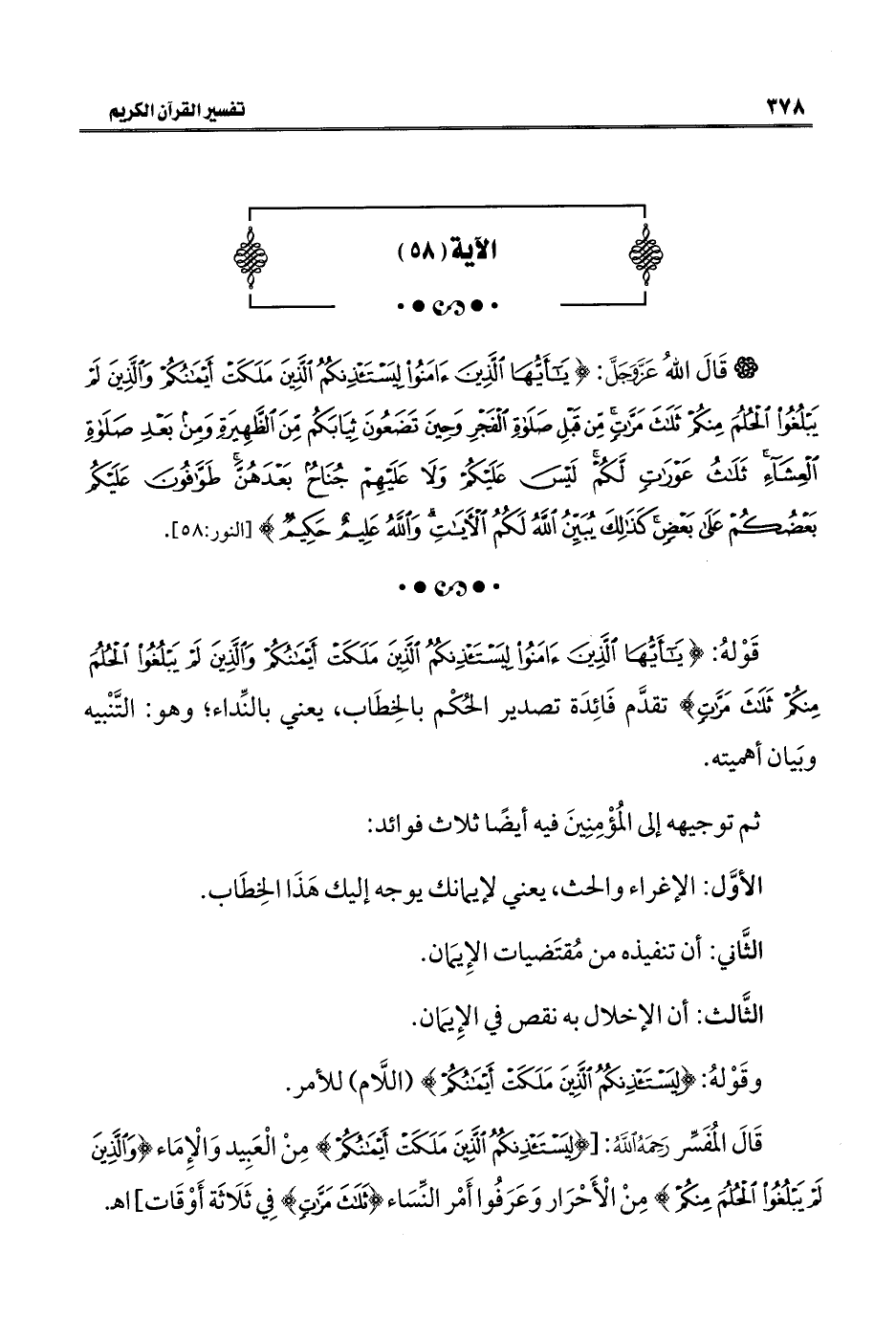 قَوْلهُ: {يَاأَيُّهَا الَّذِينَ آمَنُوا لِيَسْتَأْذِنْكُمُ الَّذِينَ مَلَكَتْ أَيْمَانُكُمْ وَالَّذِينَ لَمْ يَبْلُغُوا الْحُلُمَ مِنْكُمْ ثَلَاثَ مَرَّاتٍ} تقدَّم فَائِدَة تصدير الحُكْم بالخِطَاب، يعني بالنِّداء؛ وهو: التَّنْبيه وبَيان أهميته.