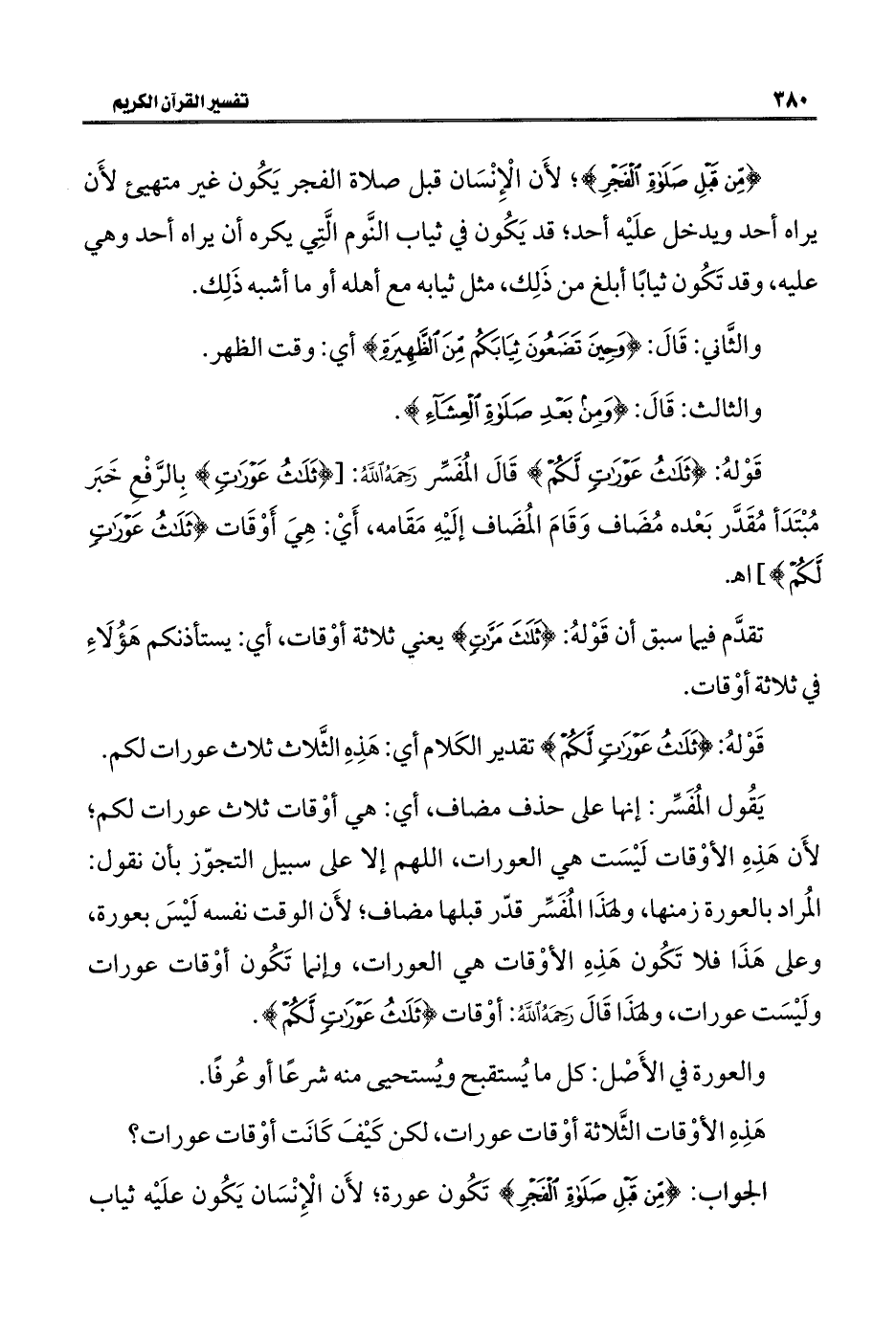 يَقُول المُفَسِّر: إنها على حذف مضاف، أي: هي أوْقات ثلاث عورات لكم؛ لأَن هَذِهِ الأوْقات لَيْسَت هي العورات، اللهم إلَّا على سبيل التجوّز بأن نقول: المُراد بالعورة زمنها، ولِهَذَا المُفَسِّر قدّر قبلها مضاف؛ لأَن الوقت نفسه لَيْسَ بعورة، وعلى هَذَا فلا تَكُون هَذِهِ الأوْقات هي العورات، وإنَّما تَكُون أوْقات عورات ولَيْسَت عورات، ولِهَذَا قَالَ رَحَمَهُ الملَّهُ: أوْقات {ثَلَاثُ عَوْرَاتٍ لَكُمْ}.