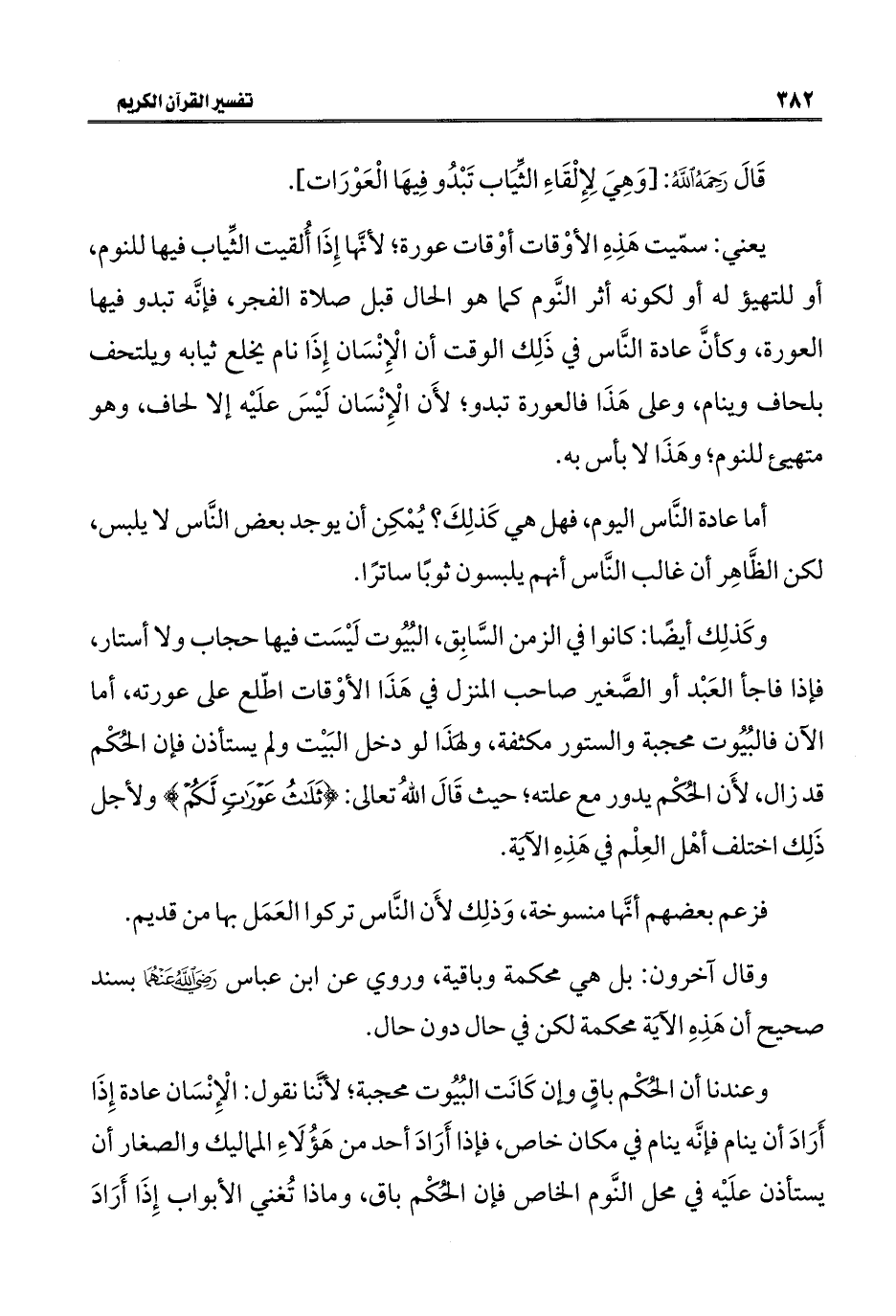 وكَذلِك أيضًا: كانوا في الزمن السَّابِق، البُيُوت لَيْسَت فيها حجاب ولا أستار، فإذا فاجأ العَبْد أو الصَّغير صاحب المنزل في هَذَا الأوْقات اطّلع على عورته، أما الآن فالبُيُوت محجبة والستور مكثفة، ولهَذَا لو دخل البَيْت ولم يستأذن فإن الحُكْم قد زال، لأَن الحُكْم يدور مع علته؛ حيث قَالَ اللهُ تعالى: {ثَلَاثُ عَوْرَاتٍ لَكُمْ} ولأجل ذَلِك اختلف أهْل العِلْم في هَذِهِ الآية.