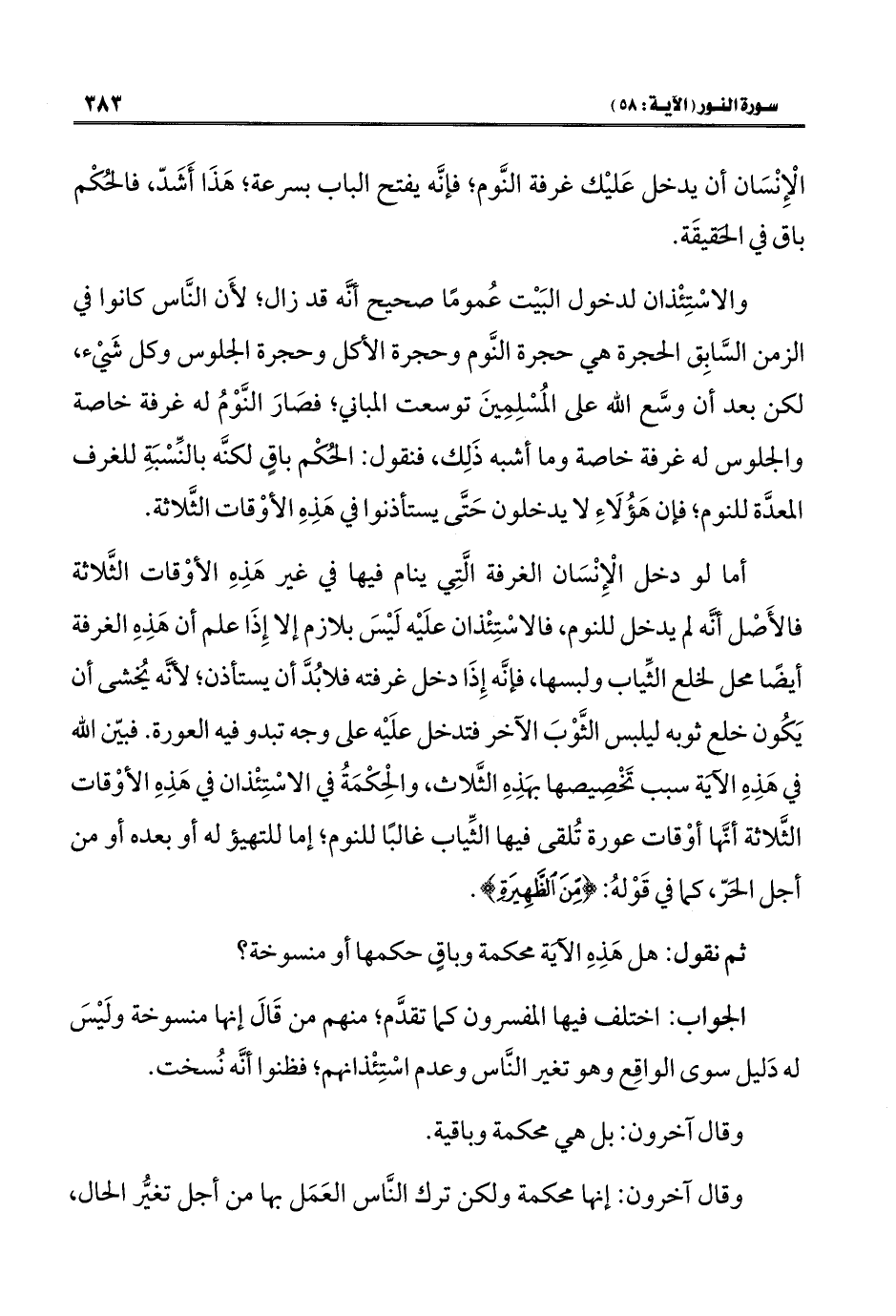 الجواب: اختلف فيها المفسرون كما تقدَّم، منهم من قَالَ إنها منسوخة ولَيْسَ له دَليل سوى الواقِع وهو تغير النَّاس وعدم اسْتِئْذانهم؛ فظنوا أنَّه نُسخت.