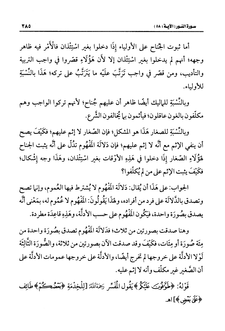 وبالنِّسْبَةِ للصغار هَذَا هو المشكل؛ فإن الصّغار لا إثم عليهم؛ فكَيْفَ يصح أن ينفي الإثم مع أنَّه لا إثم عليهم، فإن دَلالَة المَفْهُوم تدُلّ على أنَّه يثبت الجنال كوُلَاءِ الصّغار إِذَا دخلوا في هَذِهِ الأوْقات بغير اسْتِئْذان، وهَذَا وجه إِشْكال، فكَيْفَ يثبت الإثم على من لم يُكلّفوا؟