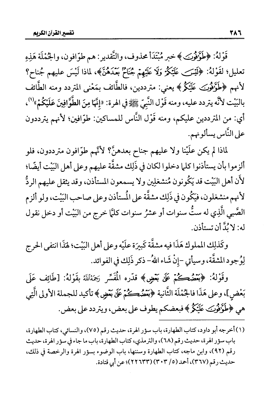 قَوْلهُ: {طَوَّافُونَ} خبر مُبْتَدَأ محذوف، والتَّقدير: هم طوّافون، والجُمْلَة هَذِهِ تعليل؛ لقَوْله: {لَيْسَ عَلَيْكُمْ وَلَا عَلَيْهِمْ جُنَاحٌ بَعْدَهُنَّ}، لماذا لَيْسَ عليهم جُناح؟ لأنهم {طَوَّافُونَ عَلَيْكُمْ} يعني: مترددين، فالطَّائف بمَعْنى المتردد ومنه الطَّائف بالبَيْت لأَنَّه يتردد عليه، ومنه قَوْل النَّبِيّ - صلى الله عليه وسلم - في الهرة: "إِنَّهَا مِنَ الطَّوَّافِينَ عَلَيْكُمْ" (¬١)، أي: من المترددين عليكم، ومنه قَوْل النَّاس للمساكين: طوّافين؛ لأنهم يترددون على النَّاس يسألونهم.