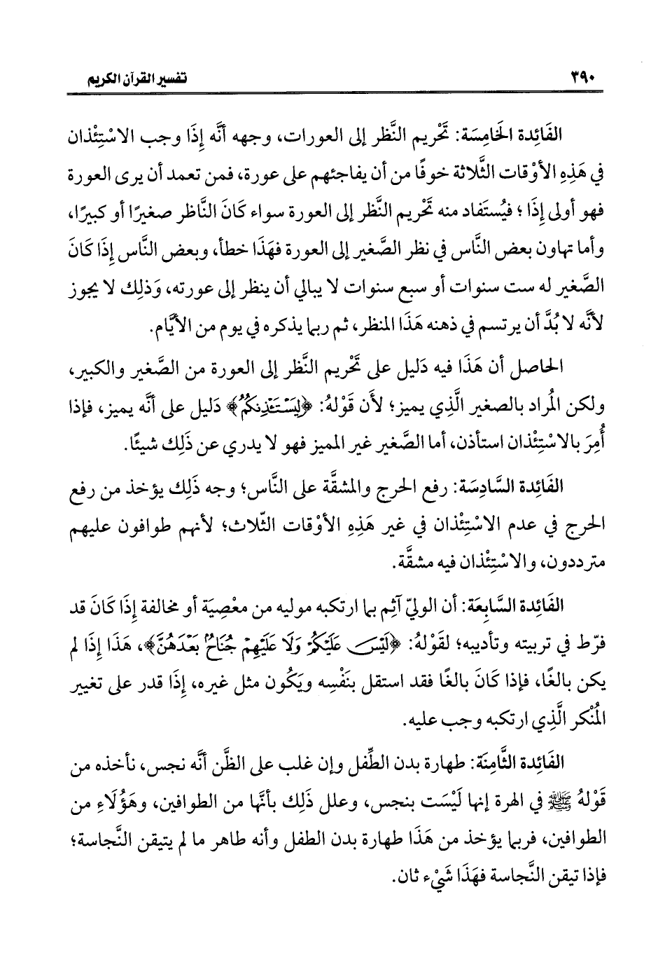 الفَائِدة الخَامِسَة: تَحْريم النَّظر إلى العورات، وجهه أنَّه إِذَا وجب الاسْتِئْذان في هَذِهِ الأوْقات الثَّلاثة خوفًا من أن يفاجئهم على عورة، فمن تعمد أن يرى العورة فهو أولى إِذَا؛ فيُستَفاد منه تَحْريم النَّظر إلى العورة سواء كَانَ النَّاظر صغيرًا أو كبيرًا، وأما تهاون بعض النَّاس في نظر الصَّغير إلى العورة فهَذَا خطأ، وبعض النَّاس إِذَا كَانَ الصَّغير له ست سنوات أو سبع سنوات لا يبالي أن ينظر إلى عورته، وَذلِك لا يجوز لأنَّه لا بُدَّ أن يرتسم في ذهنه هَذَا المنظر، ثم ربما يذكره في يوم من الأَيَّام.