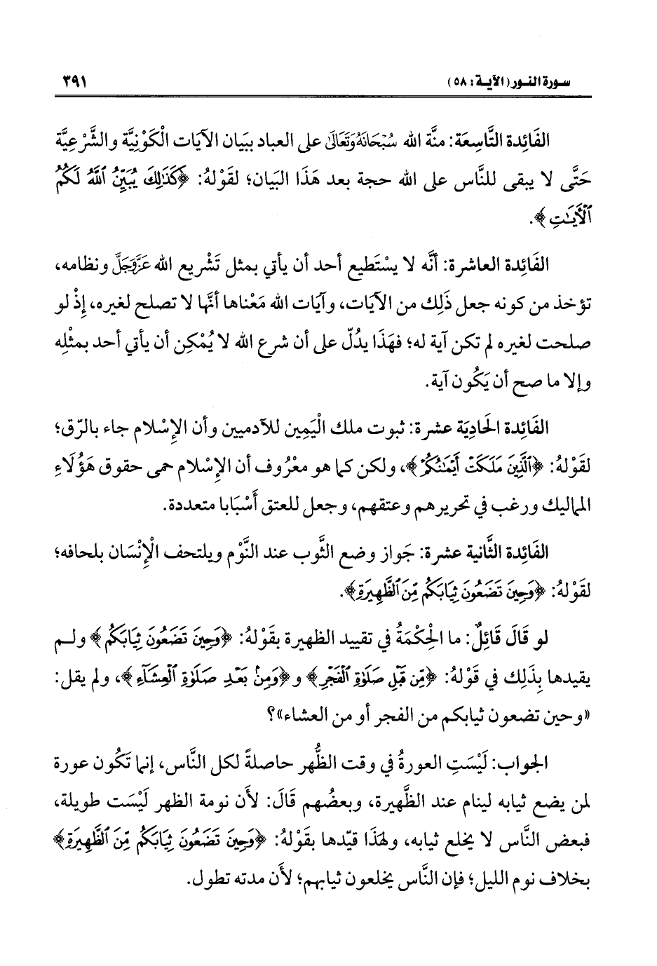الفَائِدة الثَّانية عشرة: جَواز وضع الثَّوب عند النَّوْم ويلتحف الْإِنْسَان بلحافه؛ لقَوْله: {وَحِينَ تَضَعُونَ ثِيَابَكُمْ مِنَ الظَّهِيرَةِ}.