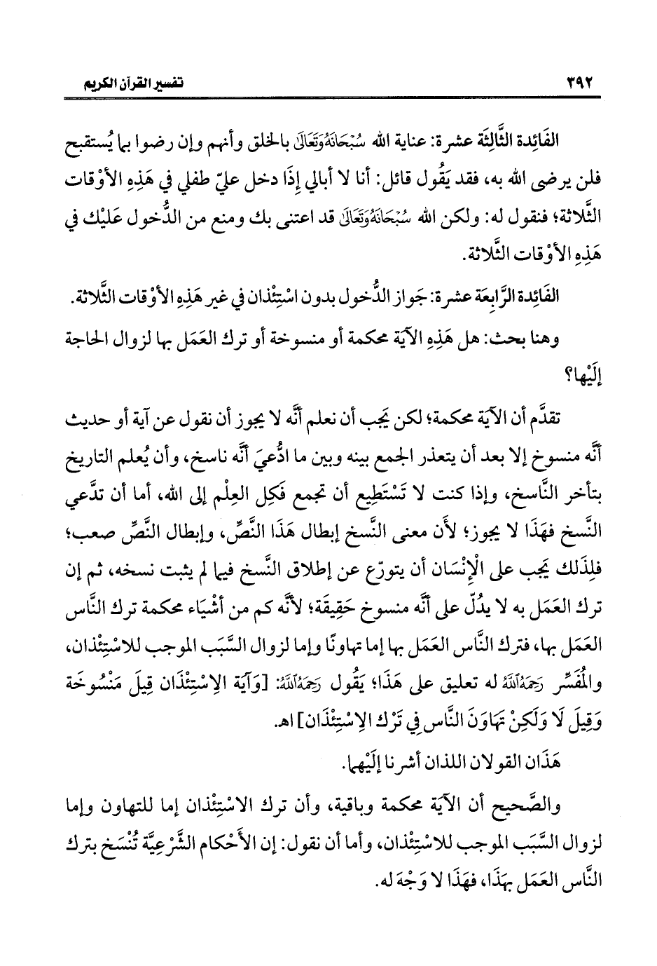 تقدَّم أن الآيَة محكمة؛ لكن يَجب أن نعلم أنَّه لا يجوز أن نقول عن آية أو حديث انَه منسوخ إلَّا بعد أن يتعذر الجمع بينه وبين ما ادُّعيَ أنَّه ناسخ، وأن يُعلم التاريخ بتأخر النَّاسخ، وإذا كنت لا تَسْتَطِيع أن تجمع فَكل العِلْم إلى الله، أما أن تدَّعي النَّسخ فهَذَا لا يجوز؛ لأَن معنى النَّسخ إبطال هَذَا النَّصِّ، وإبطال النَّصِّ صعب؛ فلِذَلك يَجب على الْإنْسَان أن يتورّع عن إطلاق النَّسخ فيما لم يثبت نسخه، ثم إن ترك العَمَل به لا يدُلَّ على أنَّه منسوخ حَقِيقَة؛ لأنَّه كم من أشْيَاء محكمة ترك النَّاس العَمَل بها، فترك النَّاس العَمَل بها إما تهاونًا وإما لزوال السَّبَب الموجب للاسْتِئْذان، والمُفَسِّر رَحَمَهُ اللهُ له تعليق على هَذَا؛ يَقُول رَحَمَهُ اللهُ: {وَآيَة الاسْتِئْذَان قِيلَ مَنْسُوخَة وَقِيلَ لَا وَلَكِنْ تهَاوَنَ النَّاس فِي تَرْك الاسْتِئْذَان] اهـ.