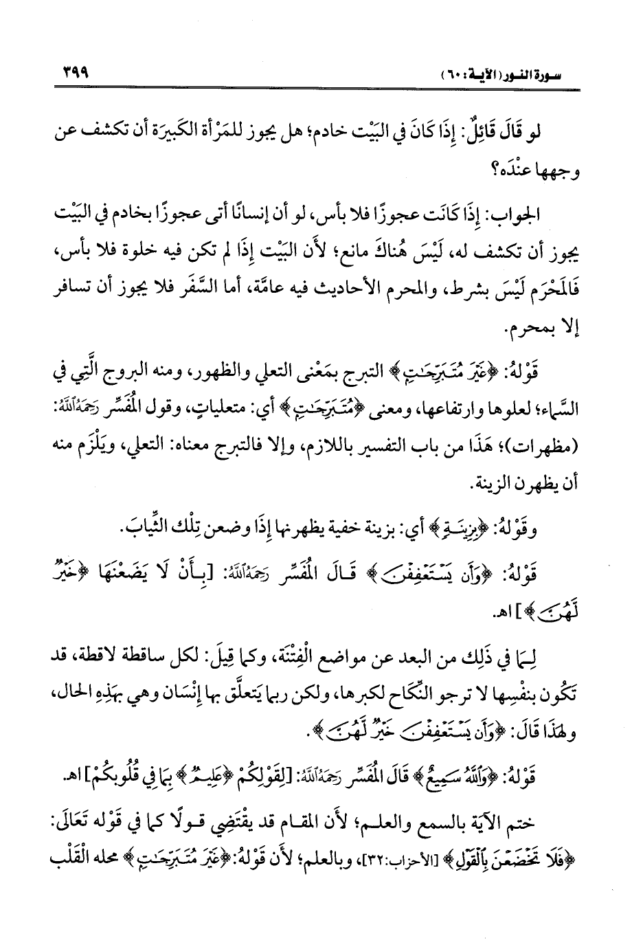 قَوْلهُ: {وَأَنْ يَسْتَعْفِفْنَ خَيْرٌ لَهُنَّ} قَالَ المُفَسِّر رَحَمَهُ اللَّهُ: [بِأَنْ لَا يَضَعْنَهَا {خَيْرٌ لَهُنَّ}] اهـ.