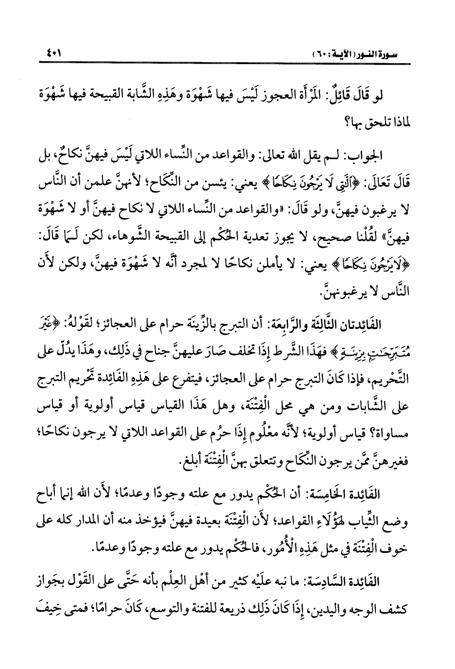الجواب: لم يقل الله تعالى: والقواعد من النِّساء اللاتي لَيْسَ فيهنَّ نكاحٌ، بل قَالَ تَعَالَى: {اللَّاتِي لَا يَرْجُونَ نِكَاحًا} يعني: يئسن من النِّكاح؛ لأنَّهنَّ علمن أن النَّاس لا يرغبون فيهنَّ، ولو قَالَ: "والقواعد من النِّساء اللاتي لا نكاح فيهنَّ أو لا شَهْوَة فيهنَّ" لقُلْنا صحيح، لا يجوز تعدية الحُكْم إلى القبيحة الشَّوهاء، لكن لَمَا قَالَ: {لَا يَرْجُونَ نِكَاحًا} يعني: لا يأملن نكاحًا لا لمجرد أنَّه لا شَهْوَة فيهنَّ، ولكن لأَن النَّاس لا يرغبونهنَّ.