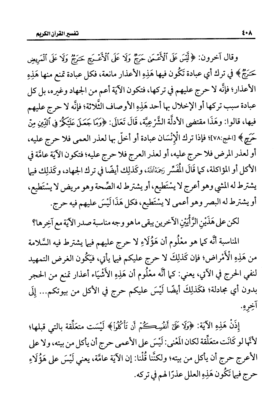 وقال آخرون: {لَيْسَ عَلَى الْأَعْمَى حَرَجٌ وَلَا عَلَى الْأَعْرَجِ حَرَجٌ وَلَا عَلَى الْمَرِيضِ حَرَجٌ} في ترك أي عبادة تَكُون فيها هَذِهِ الأعذار مانعة، فكل عبادة تمنع منها هَذِهِ الأعذار، فإنَّه لا حرج عليهم في تركها، فتكون الآية أعم من الجهاد وغيره، بل كل عبادة سبب تركها أو الإخلال بها أحد هَذِهِ الأوصاف الثَّلاثة، فإنَّه لا حرج عليهم فيها، قالوا: وهَذَا مقتضى الأدلَّة الشَّرْعِيَّة، قَالَ تَعَالَى: {وَمَا جَعَلَ عَلَيْكُمْ فِي الدِّينِ مِنْ حَرَجٍ} [الحج: ٧٨] فإذا ترك الْإِنْسَان عبادة أو أخلّ بها لعذر العمى فلا حرج عليه، أو لعذر المرض فلا حرج عليه، أو لعذر العرج فلا حرج عليه، فتكون الآية عامَّة في الأكل أو المؤاكلة، كما قَالَ المُفَسِّر رَحَمَهُ اللَّهُ، وكَذلِك أيضًا في ترك الجهاد، وكَذلِك فيما يشترط له المشي وهو أعرج لا يسْتَطيع، أو يشترط له الصِّحة وهو مريض لا يسْتَطيع، أو يشترط له البصر وهو أعمى لا يسْتَطيع، فكل هَذَا لَيْسَ عليهم فيه حرج.
